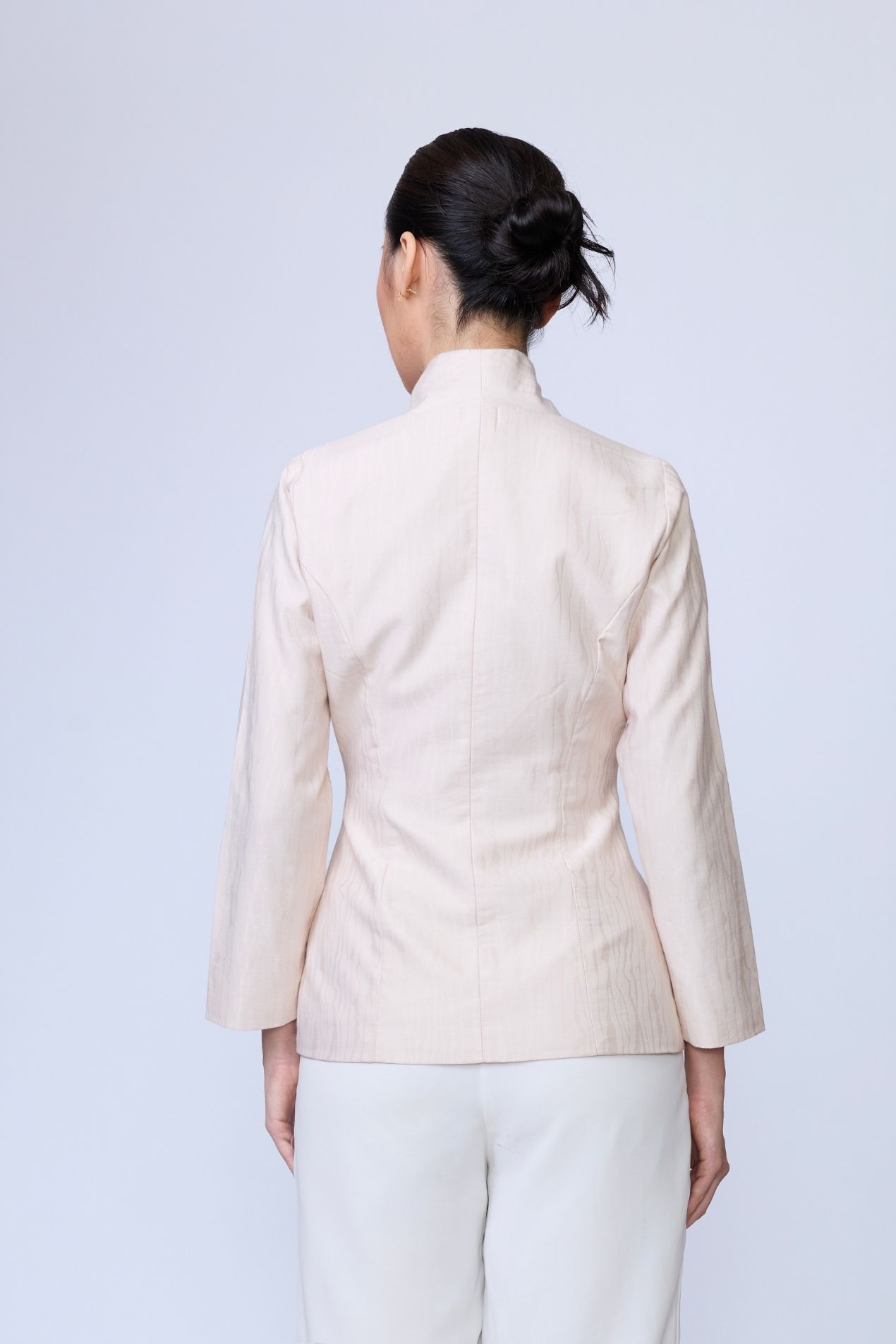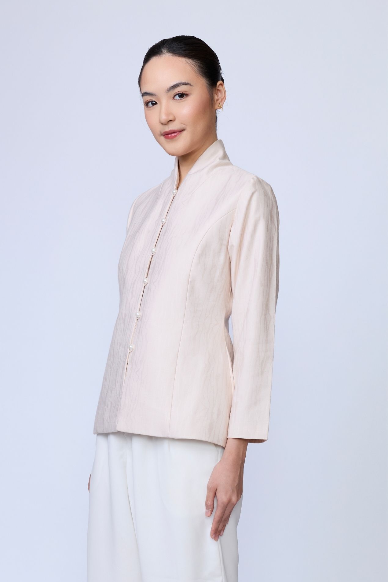 A cropped high-collar top with a structured yet fluid silhouette. Designed with clean vertical lines, subtle contour seams, and a curved hem that flatters the body. Finished with a sleek front closure, this piece balances tradition and modernity, timeless, refined, and bold. Made with a special jacquard motif for Raya 2026, inspired by the many layers that make us human and celebrating the uniqueness of every self.