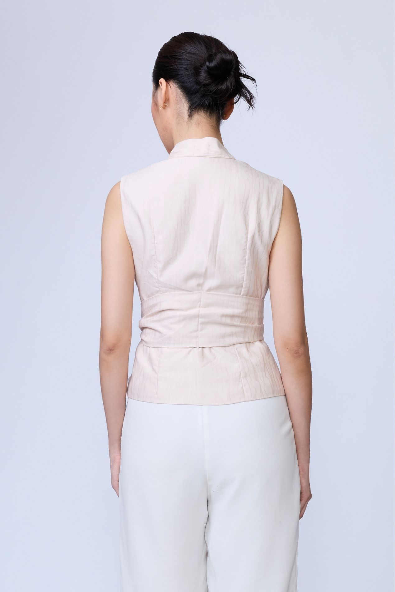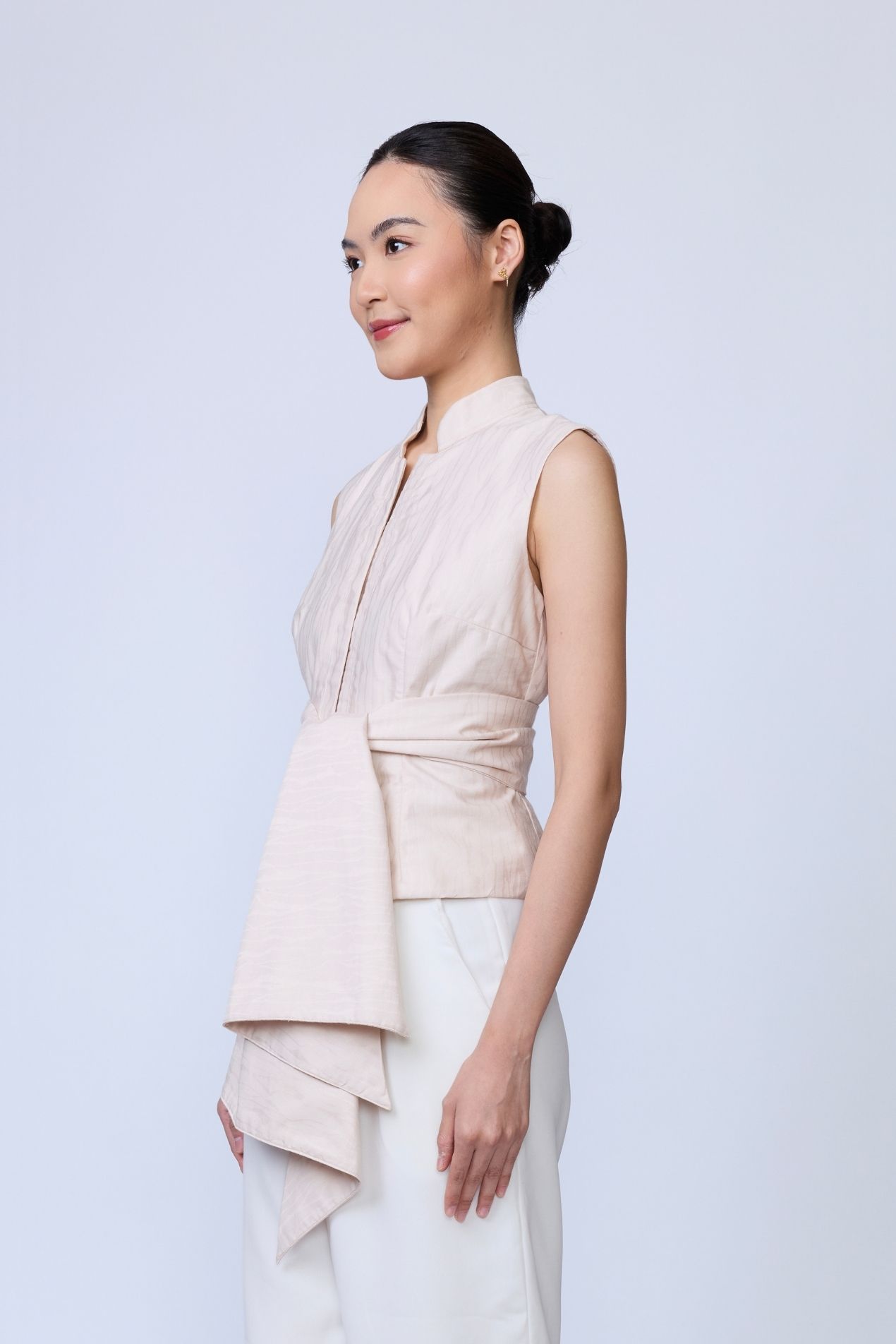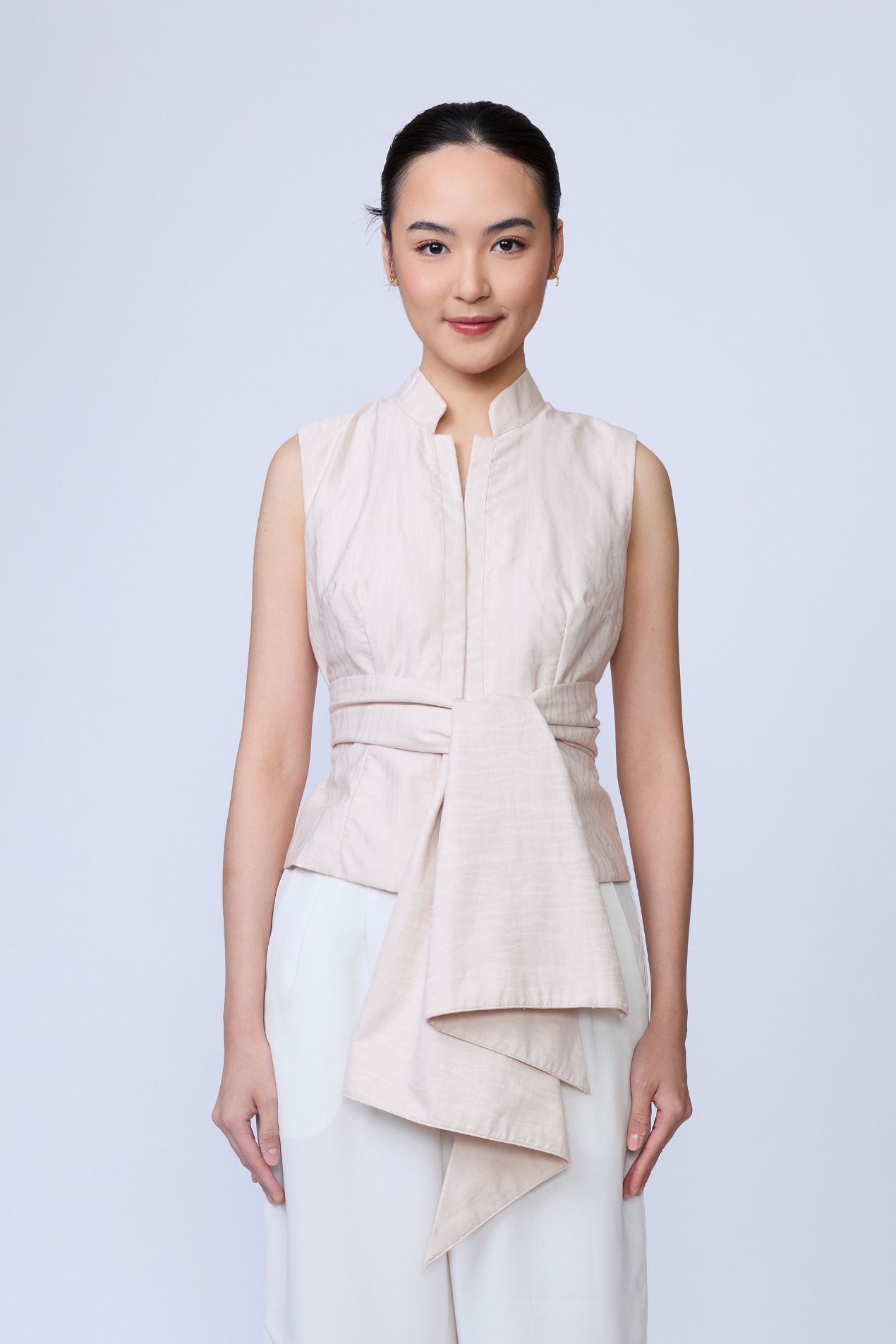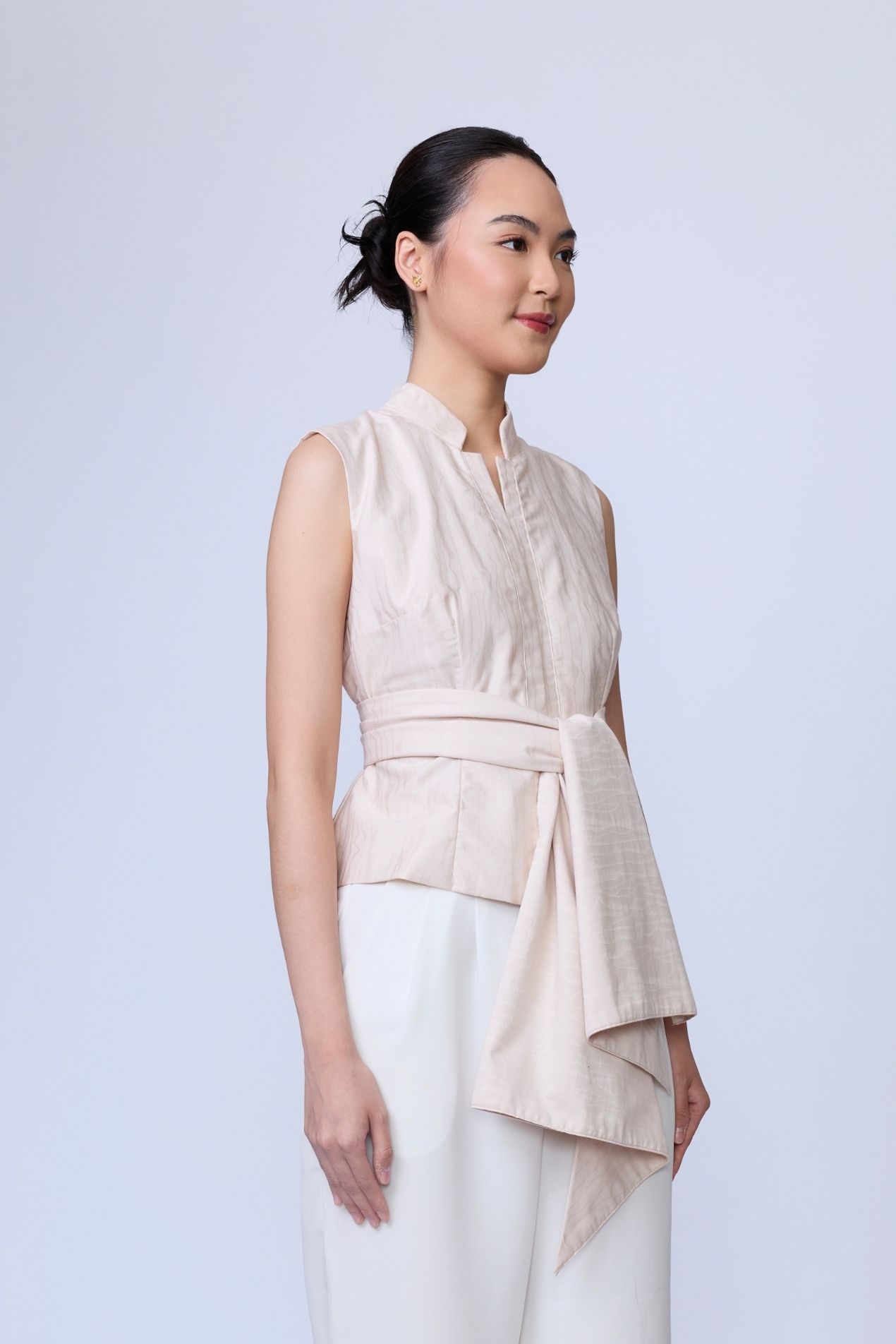 A statement sleeveless top, fitted at the waist for a flattering silhouette, featuring a soft rounded neckline with a band collar and a draped detail that elevates any look, simple, yet effortlessly striking.Made with a special jacquard motif for Raya 2026, inspired by the many layers that make us human and celebrating the uniqueness of every self.