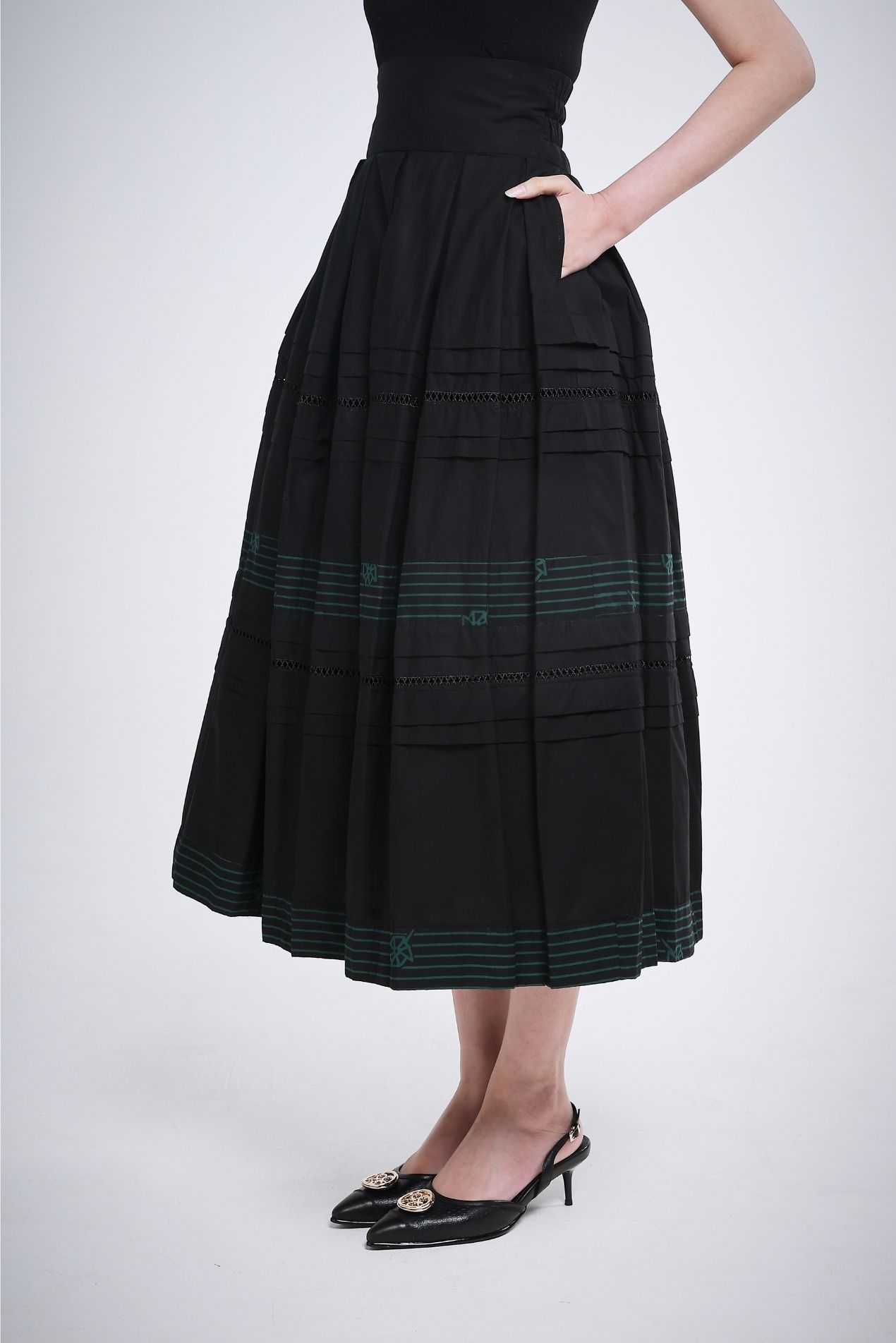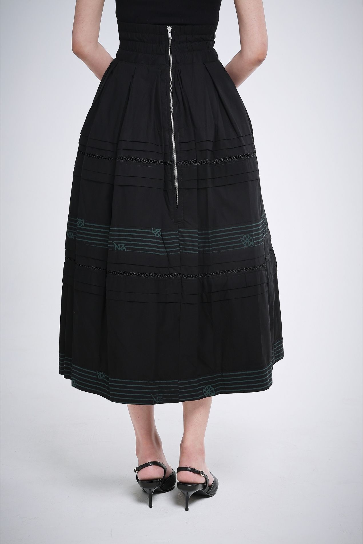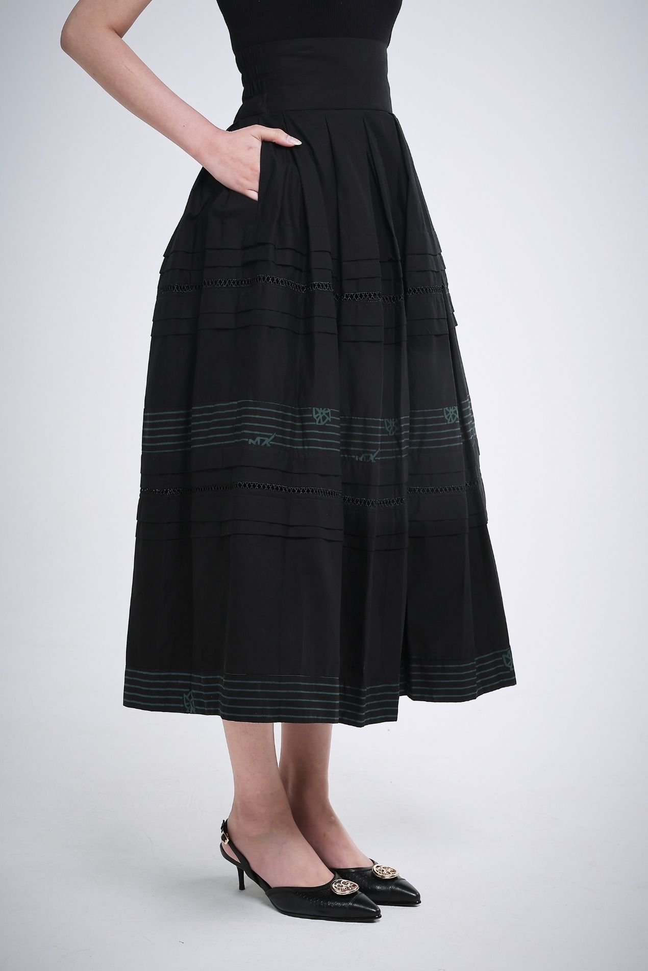 Make a subtle statement in this flowy, high-waist skirt, crafted in a flattering A-line silhouette. Two perfectly placed green batik-stamped lines add a refined touch, ideal for those who prefer a toned-down look without compromising on sophistication. A full statement piece on its own, this skirt is effortlessly versatile, pair a simple top and you’re good to go.