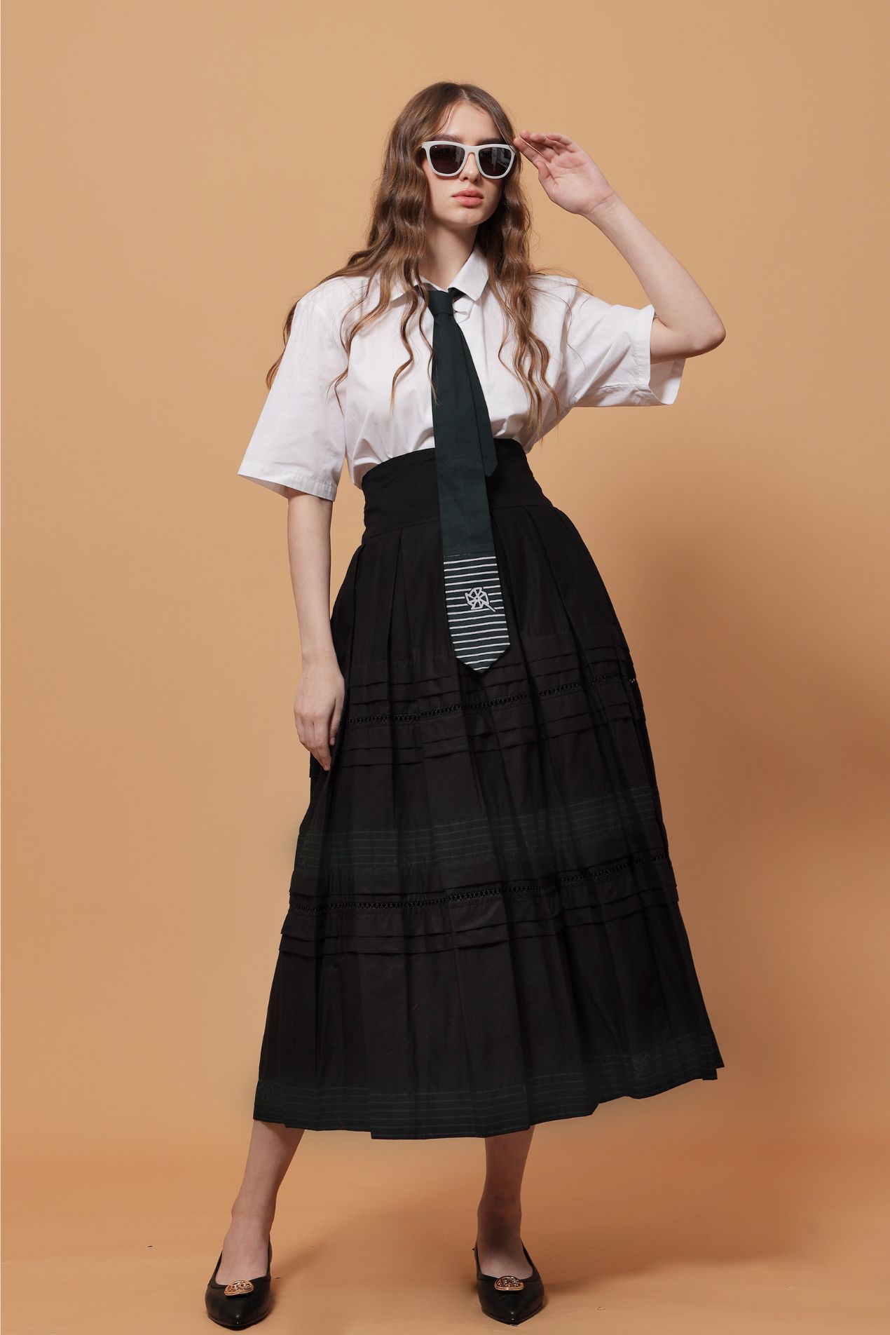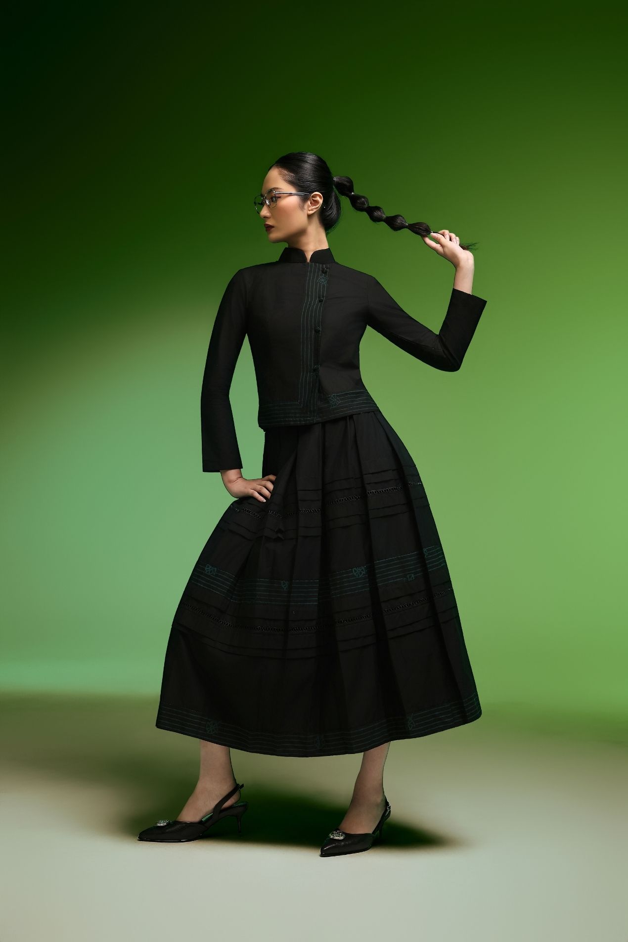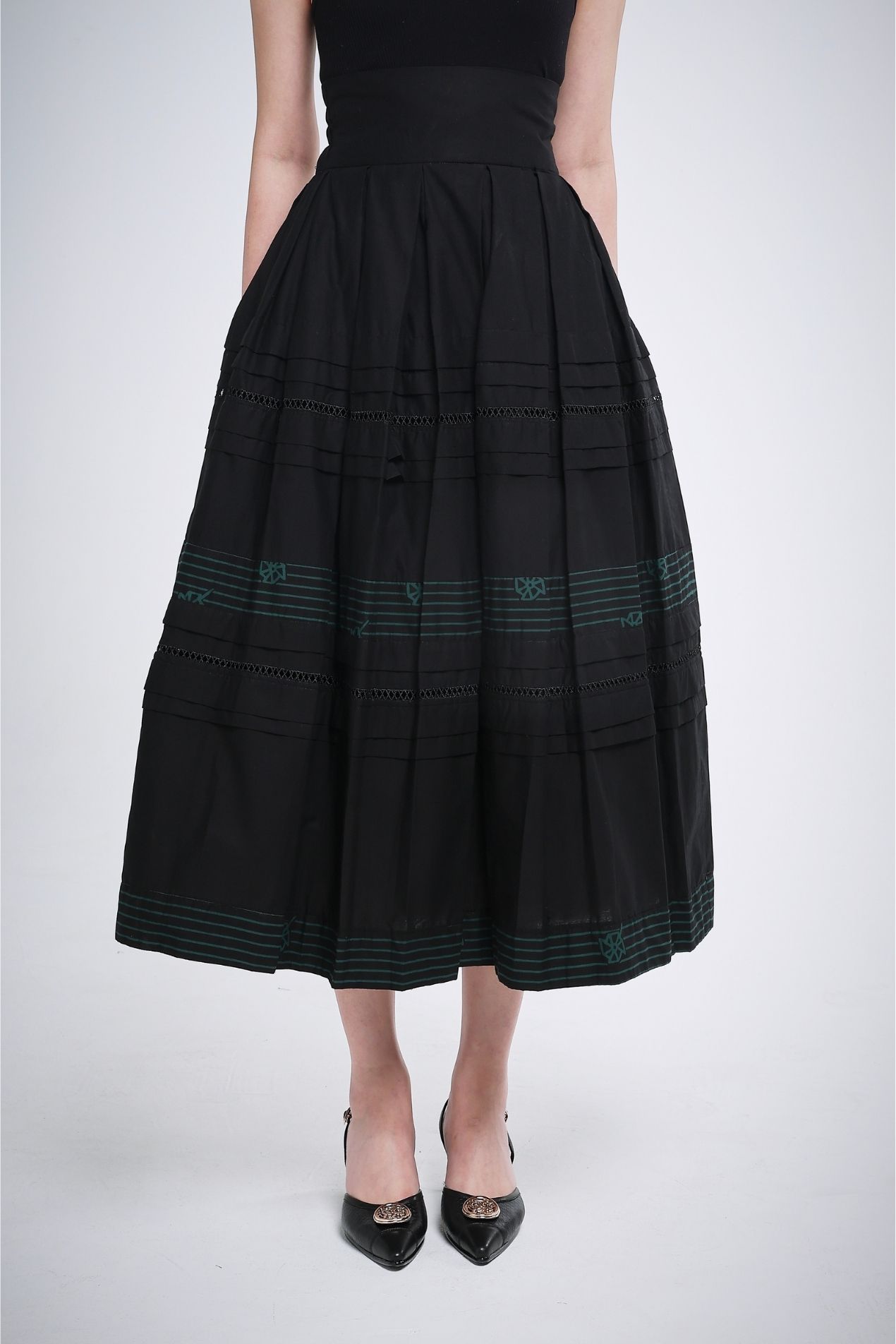 Make a subtle statement in this flowy, high-waist skirt, crafted in a flattering A-line silhouette. Two perfectly placed green batik-stamped lines add a refined touch, ideal for those who prefer a toned-down look without compromising on sophistication. A full statement piece on its own, this skirt is effortlessly versatile, pair a simple top and you’re good to go.