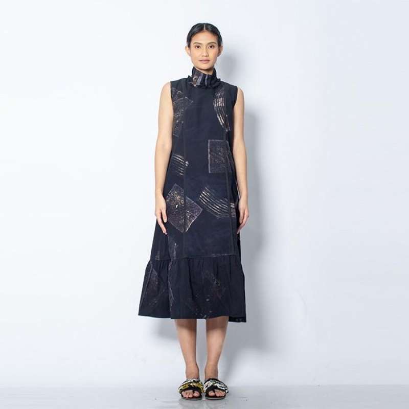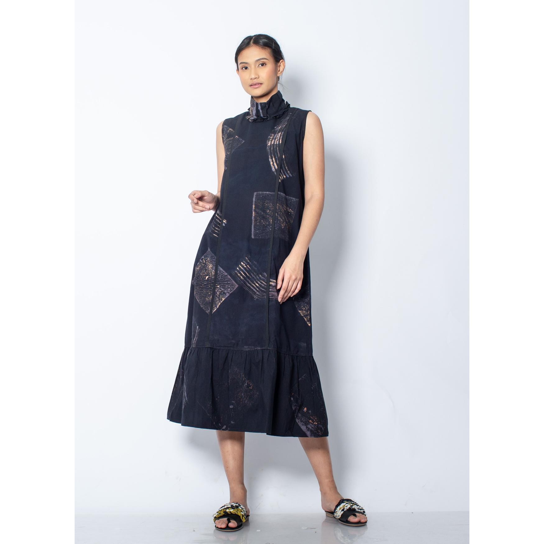 “Sleeveless dress with pleated high neckline and ruffle hem at the bottom. Falls to your calves. Proudly Made from Batik Lukis Pekalongan. Wear yours with obi to add accent to your waist.