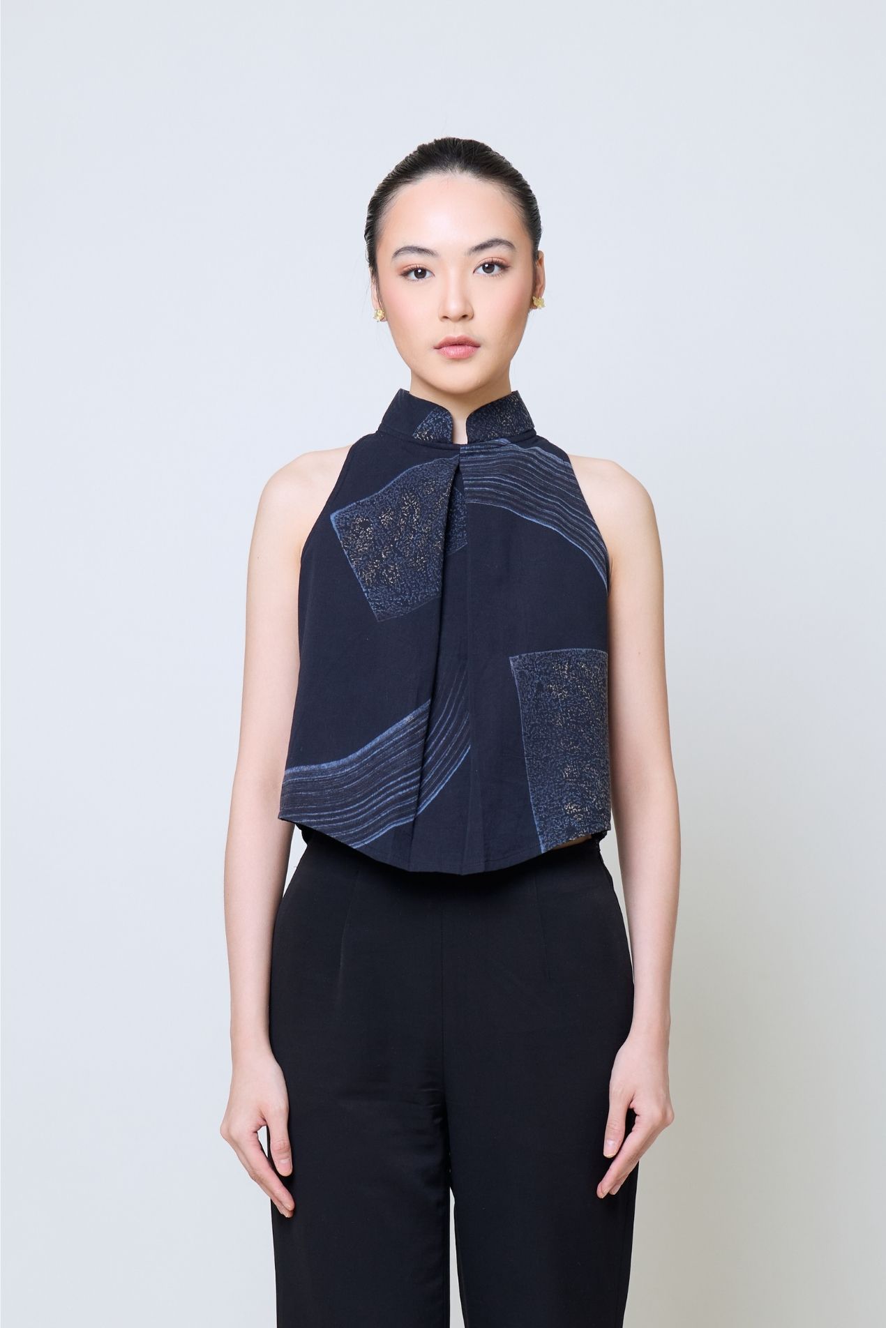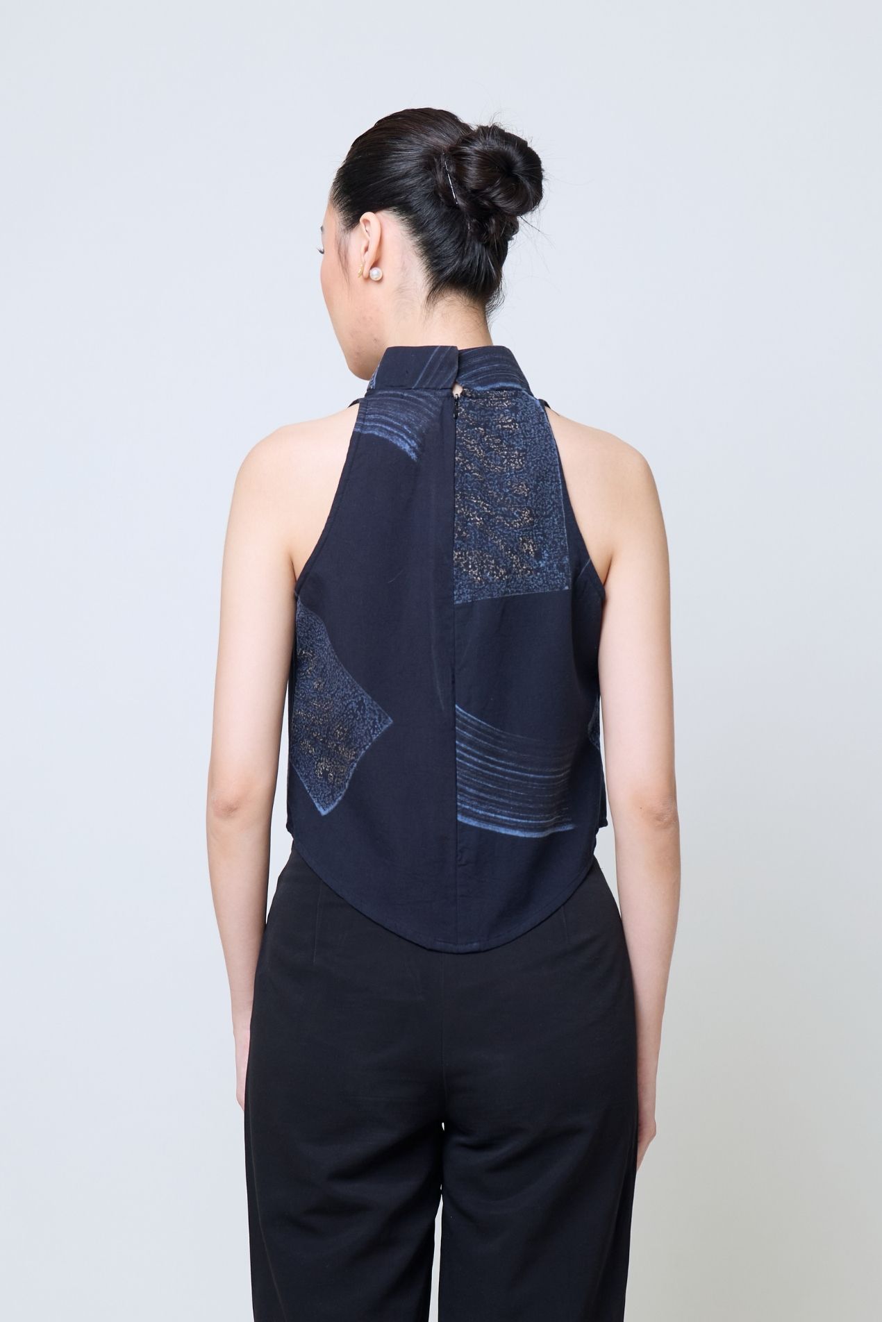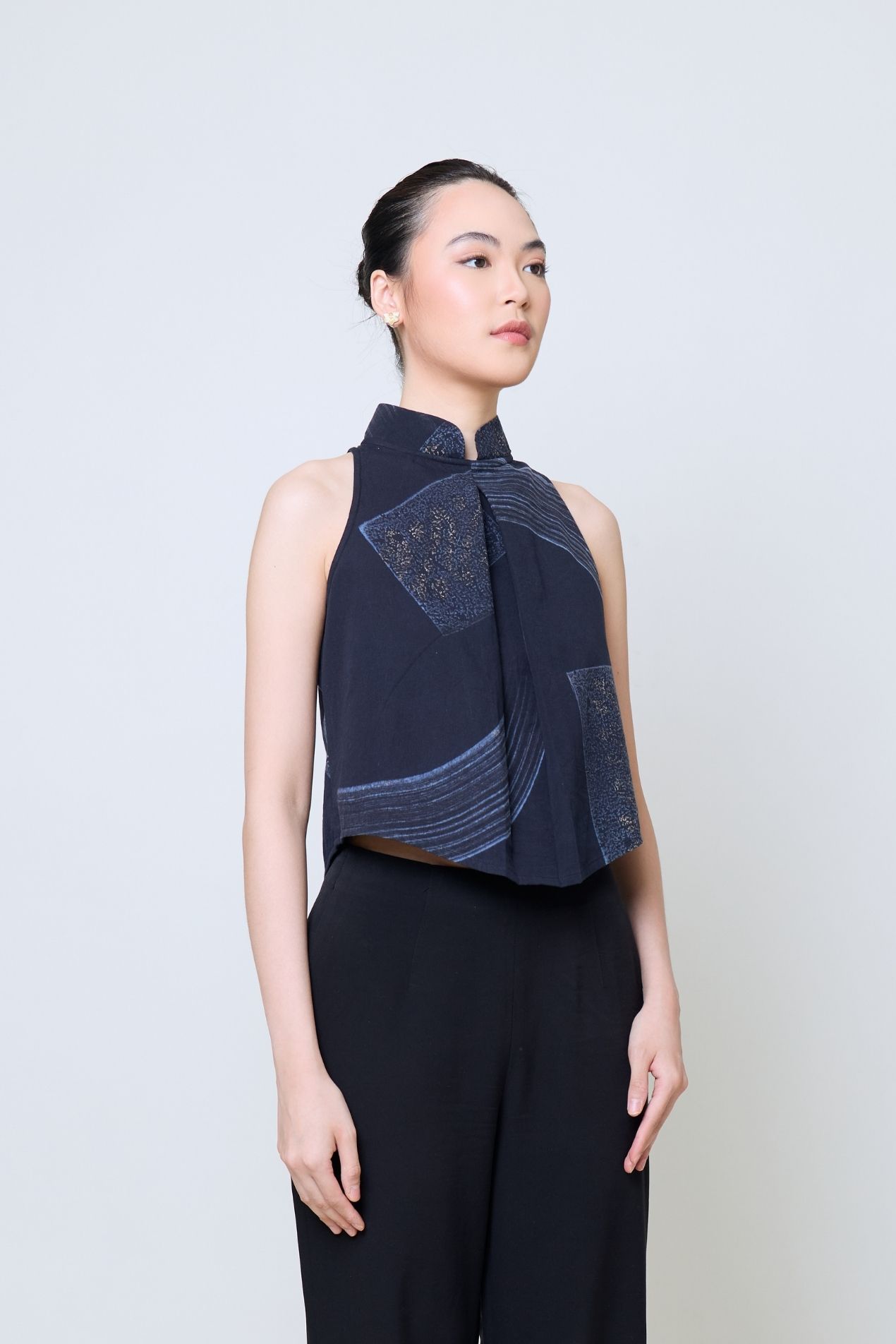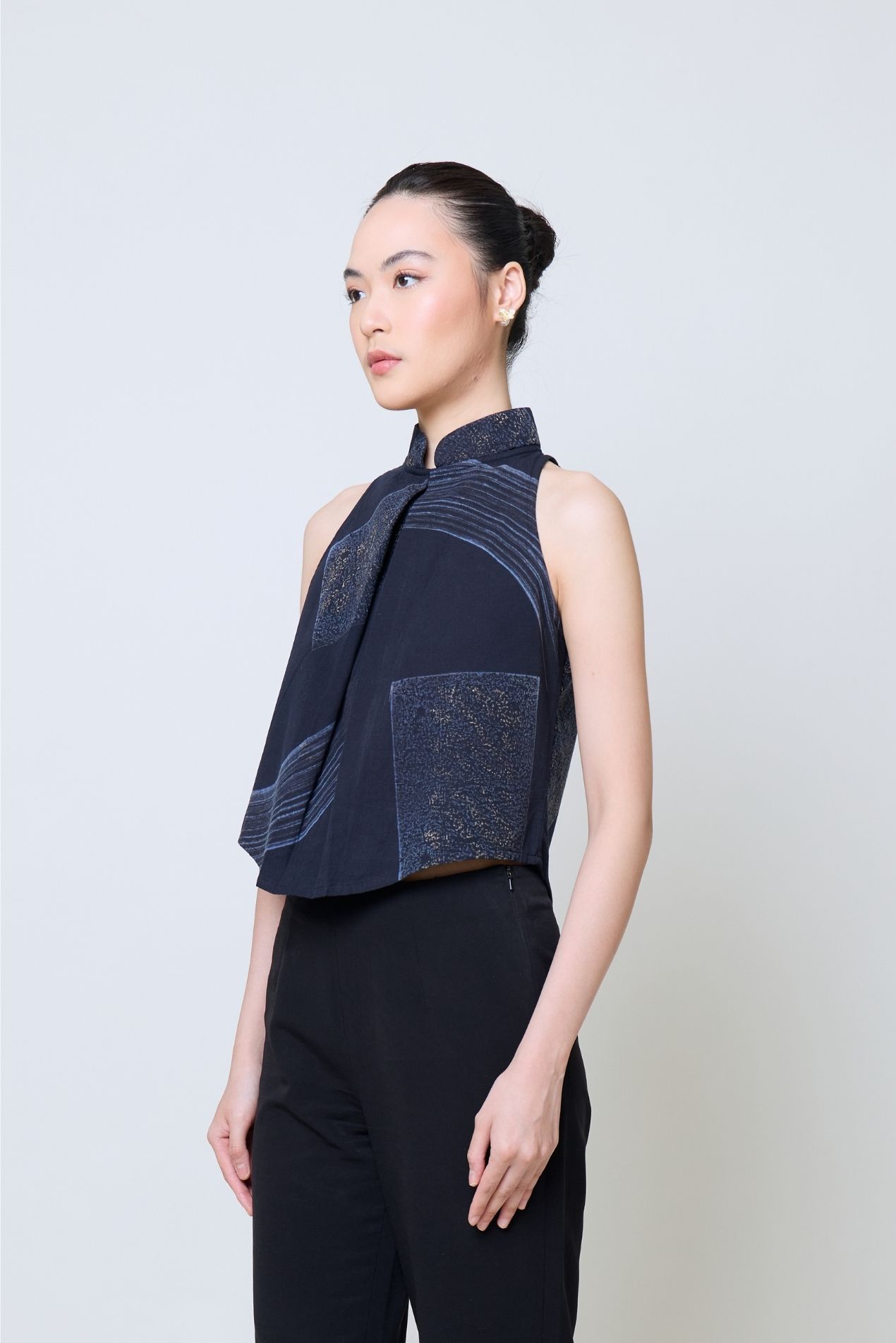 A sleeveless top with a clean shanghai collar that brings both structure and softness. You can wear it tucked in for a polished silhouette or leave it loose for a more relaxed, effortless feel. Its minimalist shape makes it easy to pair with an obi or wear on its own for a refined look. Exclusively for Poean 2.0, this fabric features a handcrafted batik technique from Pekalongan, merging stamped and brushed artistry. A refined expression of balance, craftsmanship, and heritage for modern everyday wear.