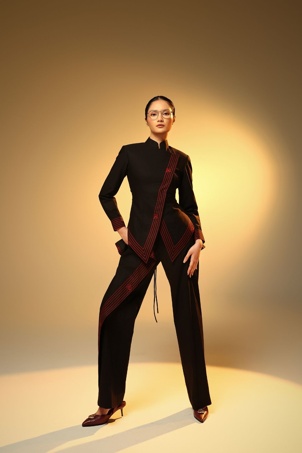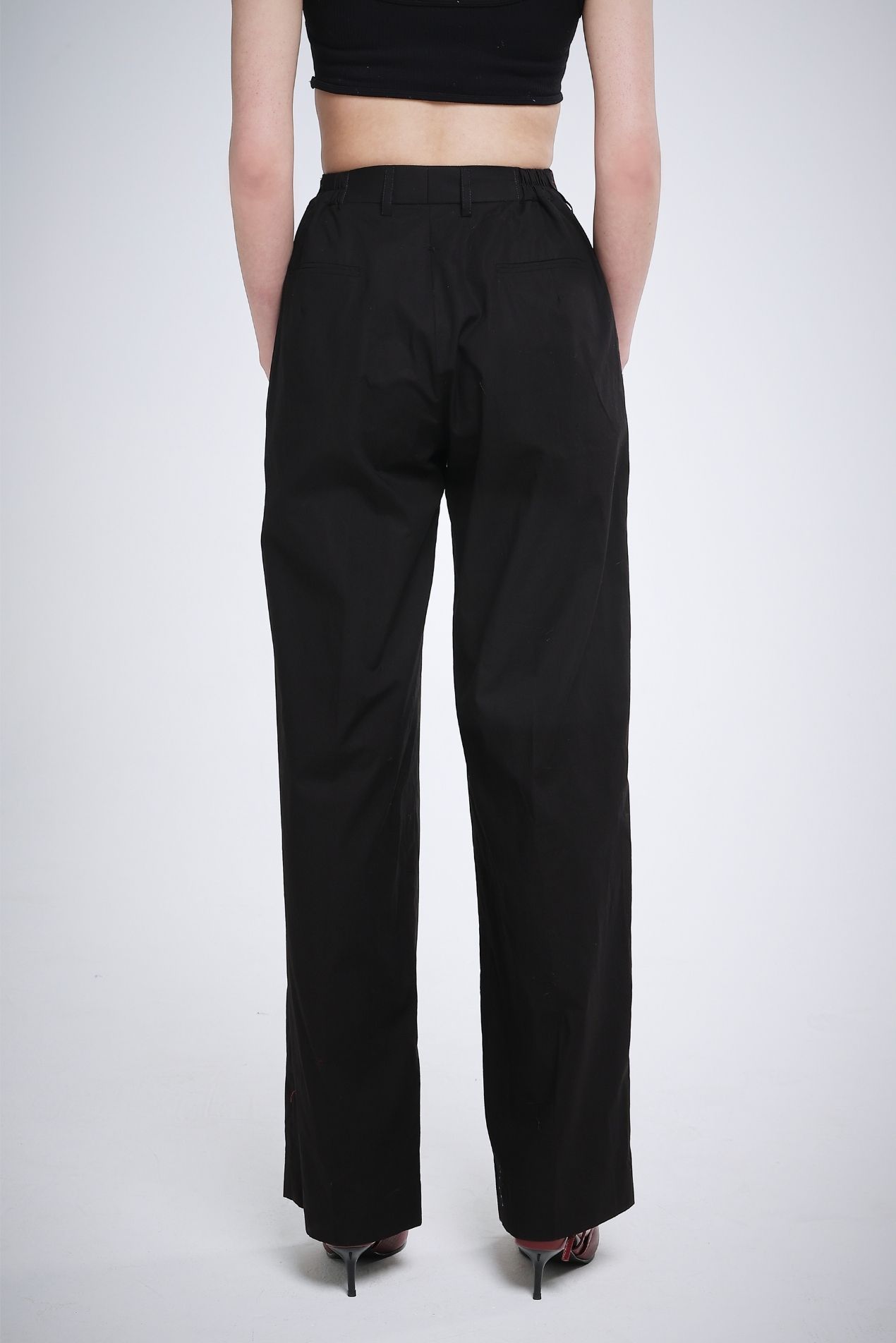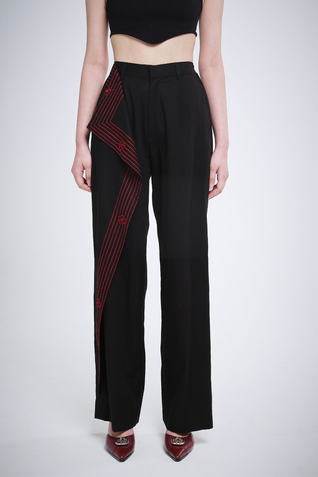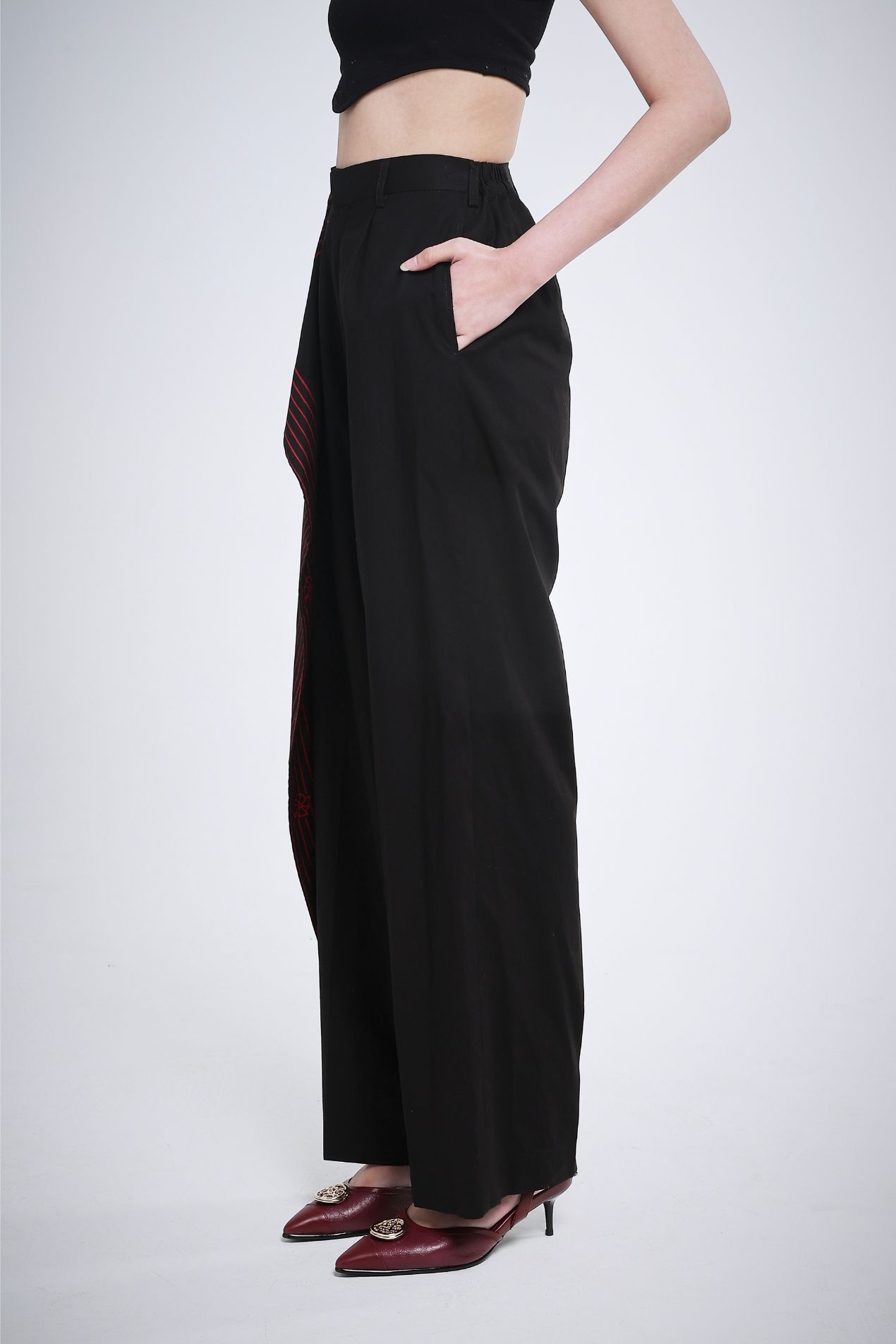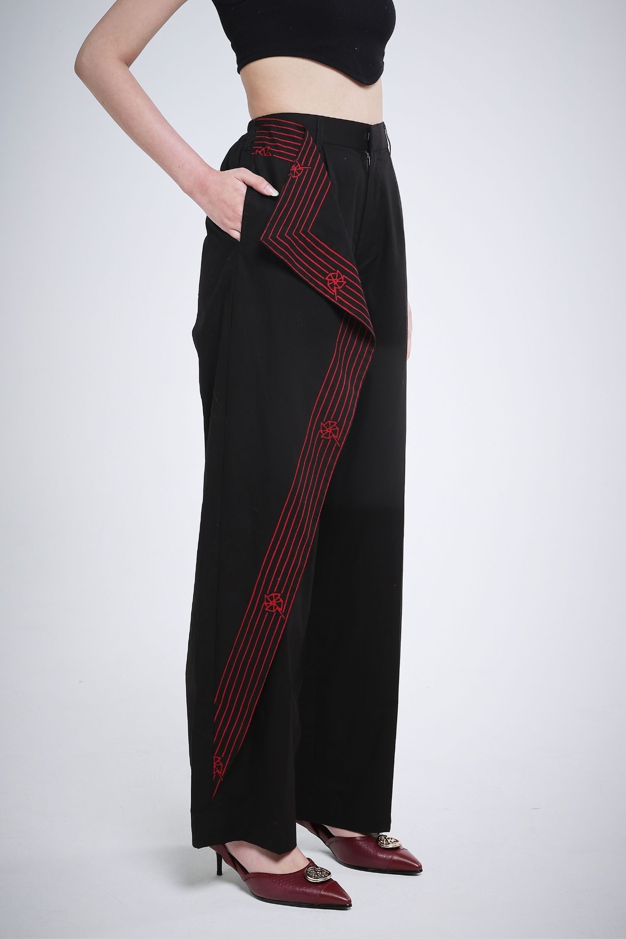Tailored for comfort with a touch of artistry, these black trousers feature a straight-leg silhouette and a structured waistband for a clean fit. A striking side panel of red line-stamped batik drapes asymmetrically from the waist, its continuous unbroken lines adding movement and a statement of heritage. Versatile yet distinctive, they bring a modern edge to traditional craftsmanship.