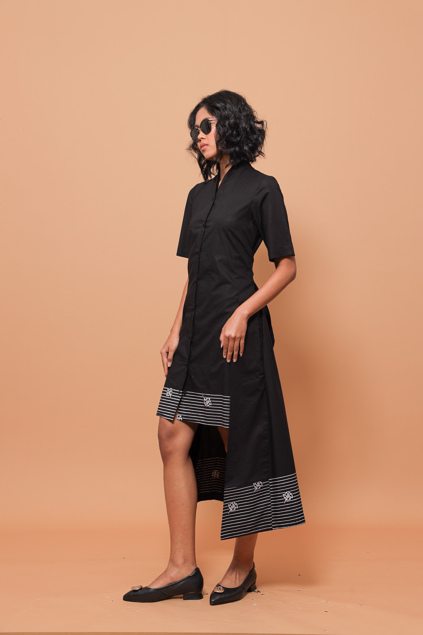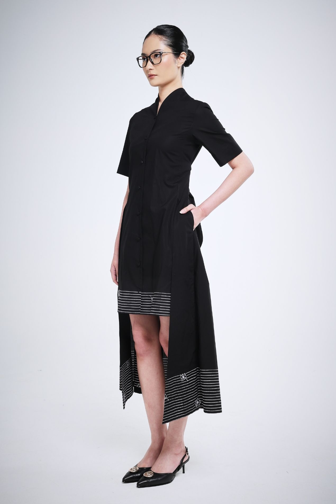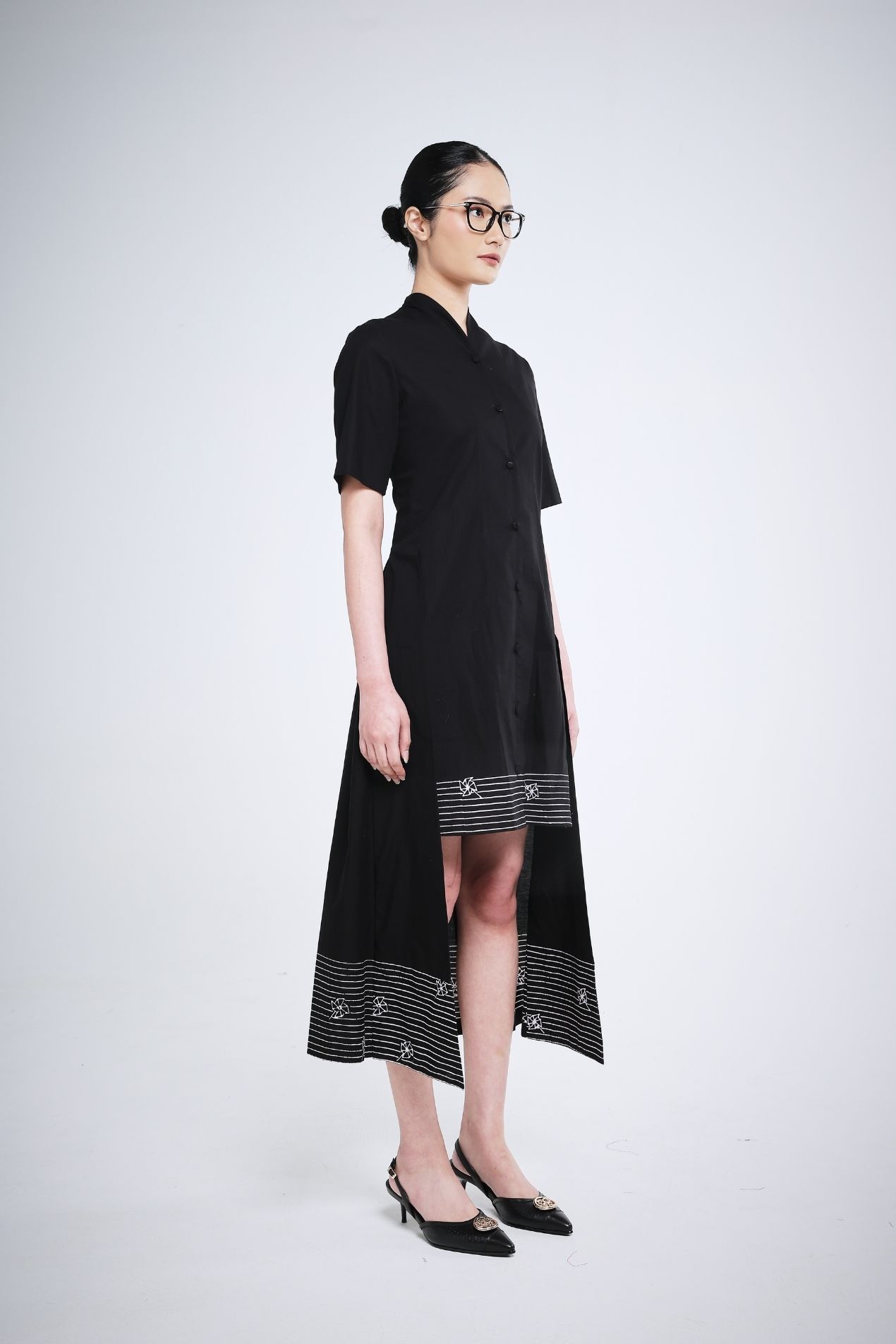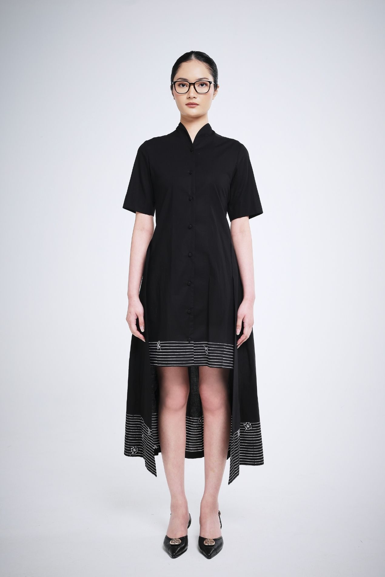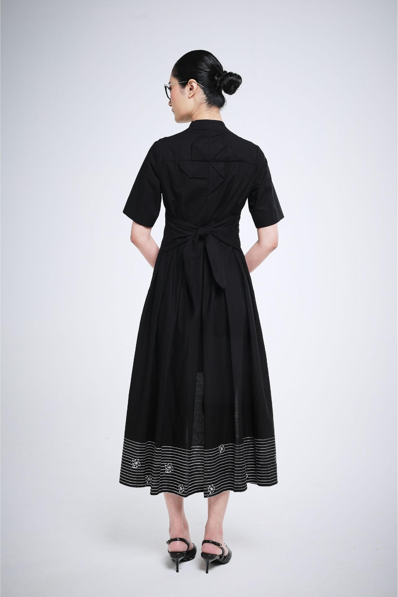 Gracefully designed, the Black White Hapu midi dress combines effortless charm with timeless elegance. Short sleeves offer comfort, while the high collar, inspired by traditional Indonesian kebaya, adds a refined, cultural touch. A long back detail flows gently with every movement, creating a subtle yet captivating statement. Perfectly balancing playful ease and sophisticated style, it’s a piece you’ll reach for day or night.