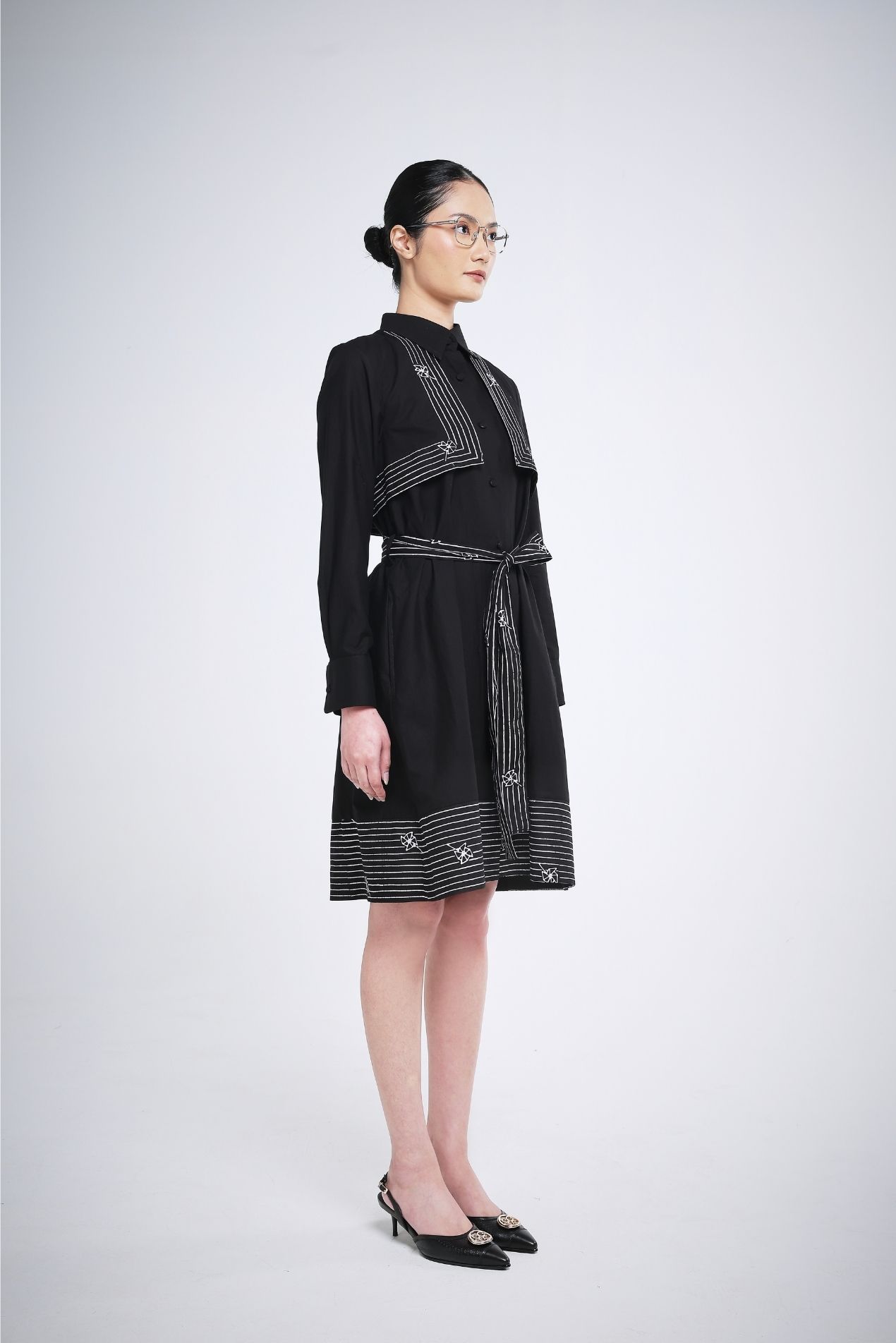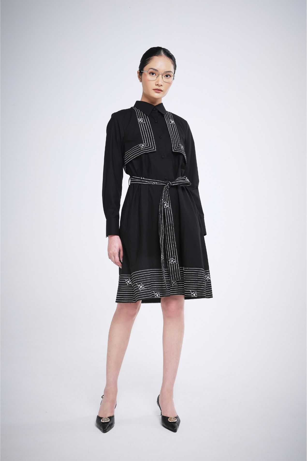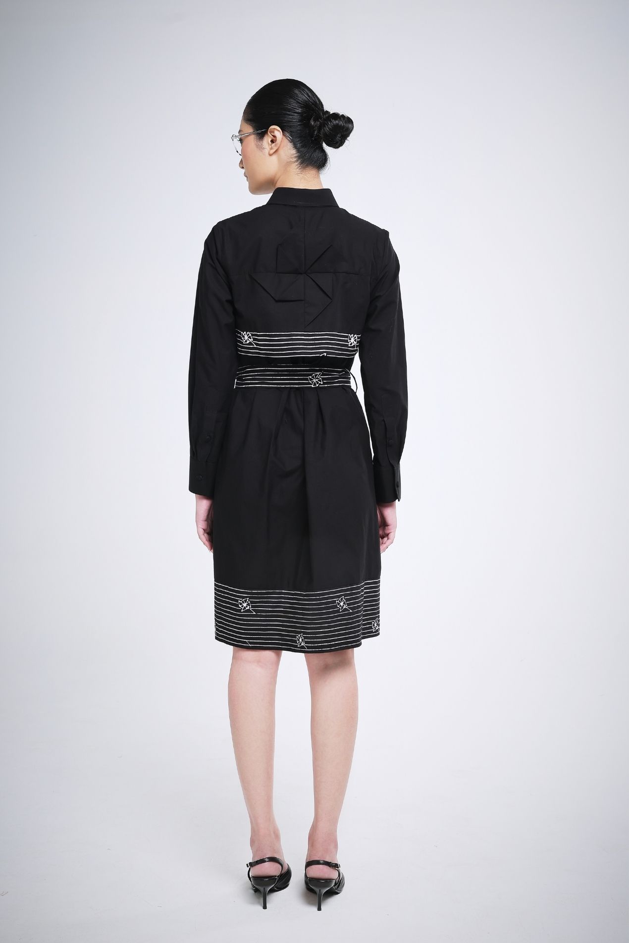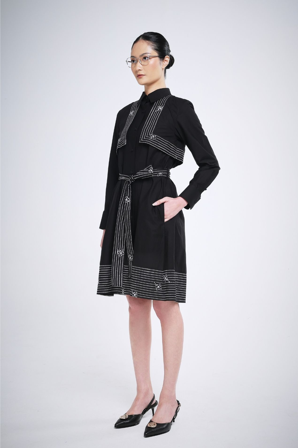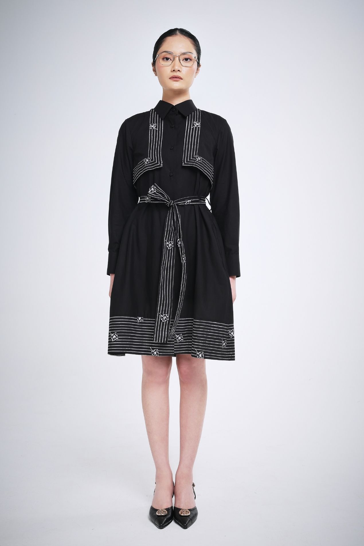 Elevate your wardrobe with this versatile midi dress in classic black, a go-to color that suits any occasion. The front lapel is adorned with a subtle line batik stamp, creating a refined statement, while long sleeves balance the dress length for an effortlessly elegant silhouette. The hem features a simple yet chic batik detail, adding a touch of sophistication without overwhelming the design. Style it your way, this dress goes anywhere with ease.