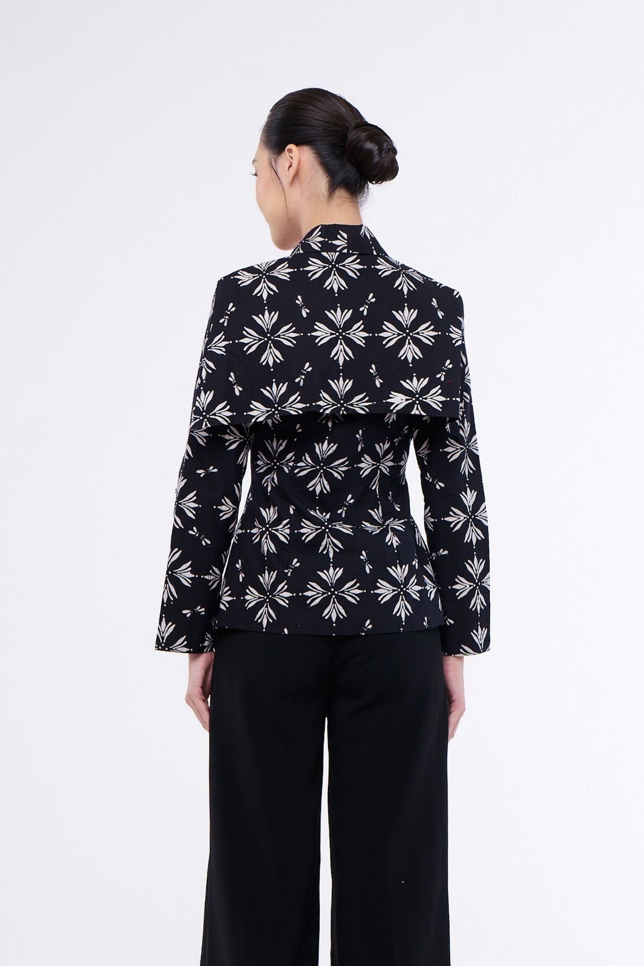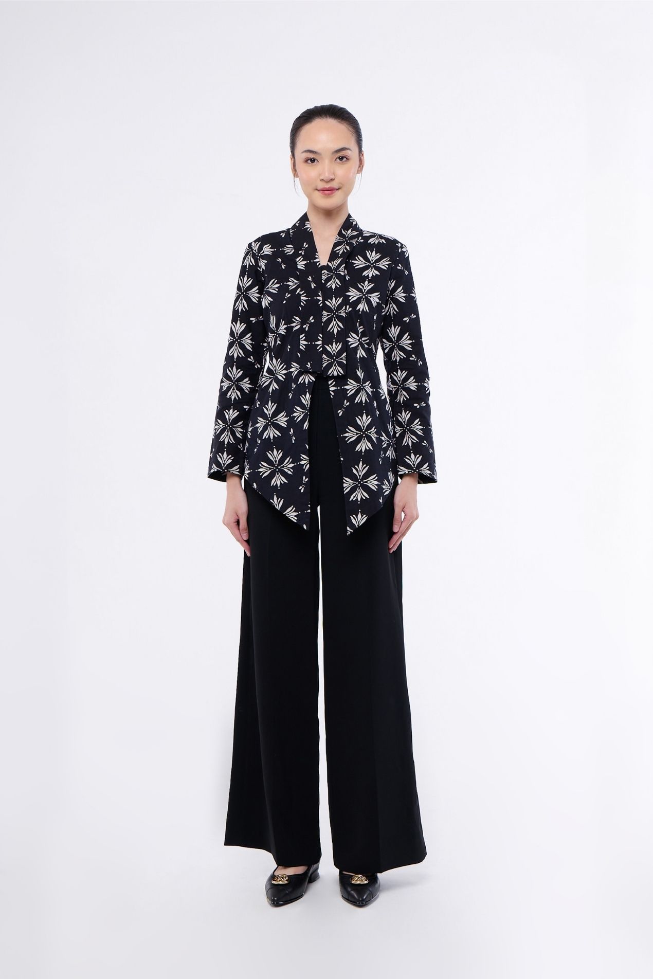 Inspired by the timeless kebaya kutubaru, the Black Yue Batik Kebaya Top is crafted from special batik stamped in Pekalongan with a refined flower motif by OE x Bocorocco. The subtle flower pattern is a quiet nod to growth and new beginnings.