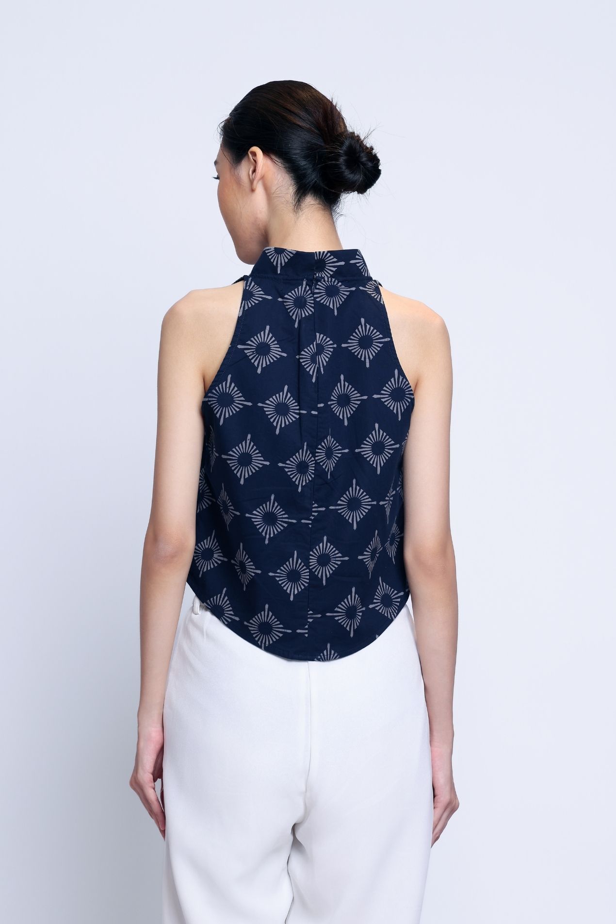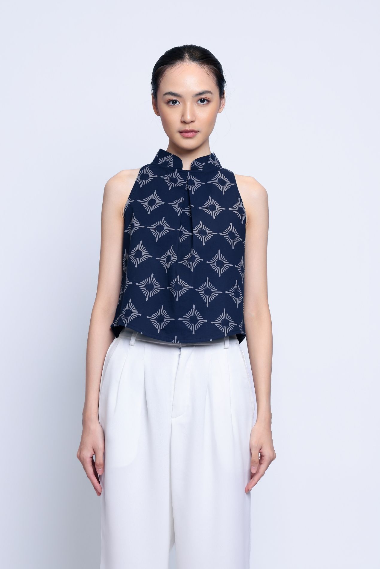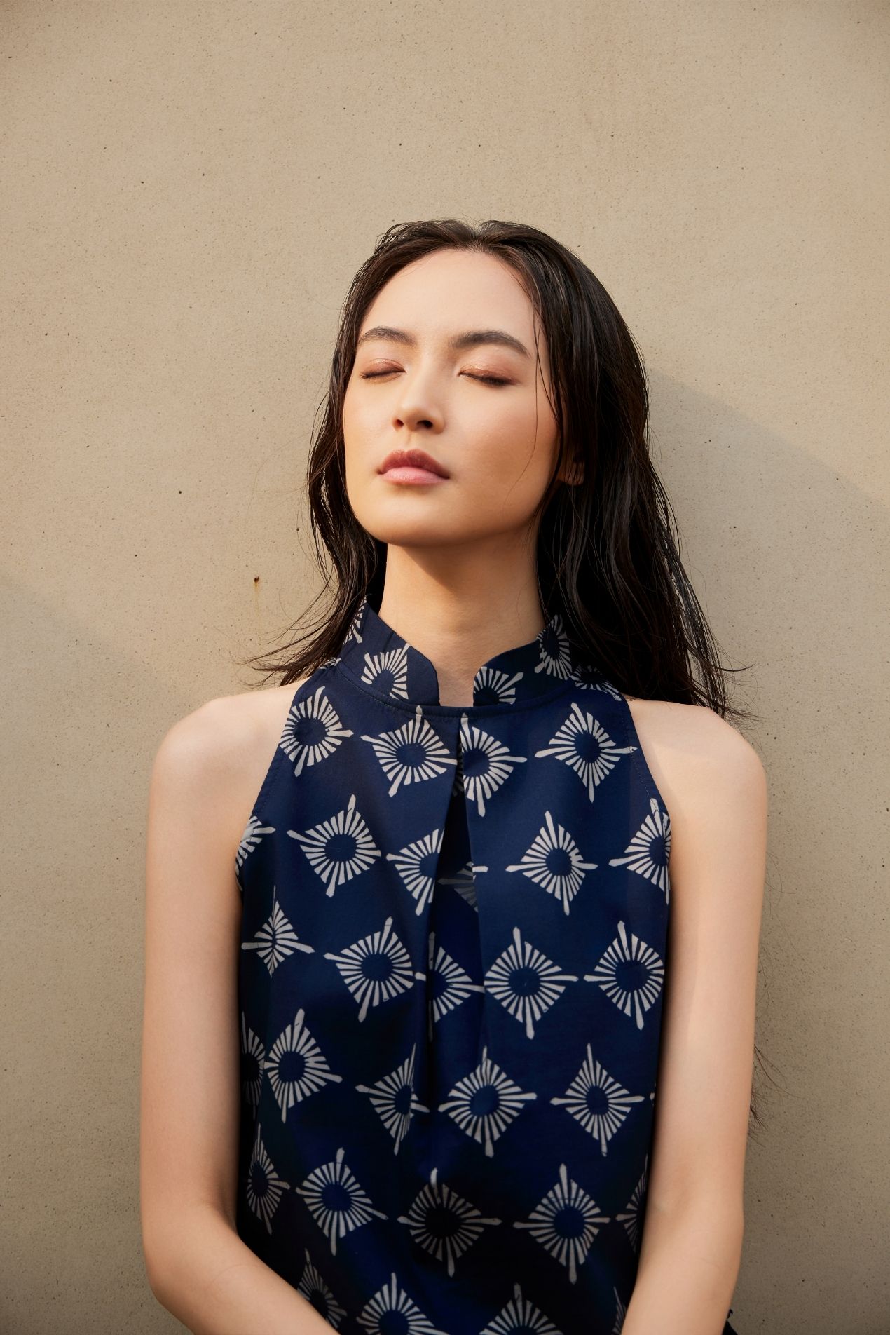 "A sleeveless top with a clean shanghai collar that brings both structure and softness. You can wear it tucked in for a polished silhouette or leave it loose for a more relaxed, effortless feel. Its minimalist shape makes it easy to pair with an obi or wear on its own for a refined summer look.