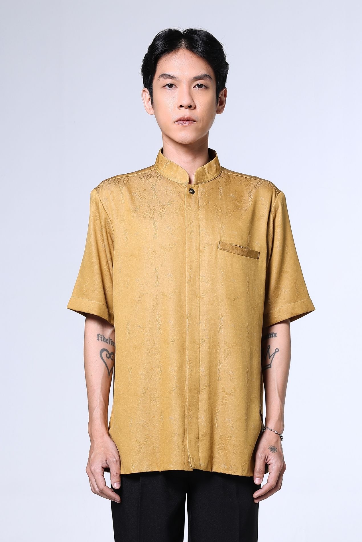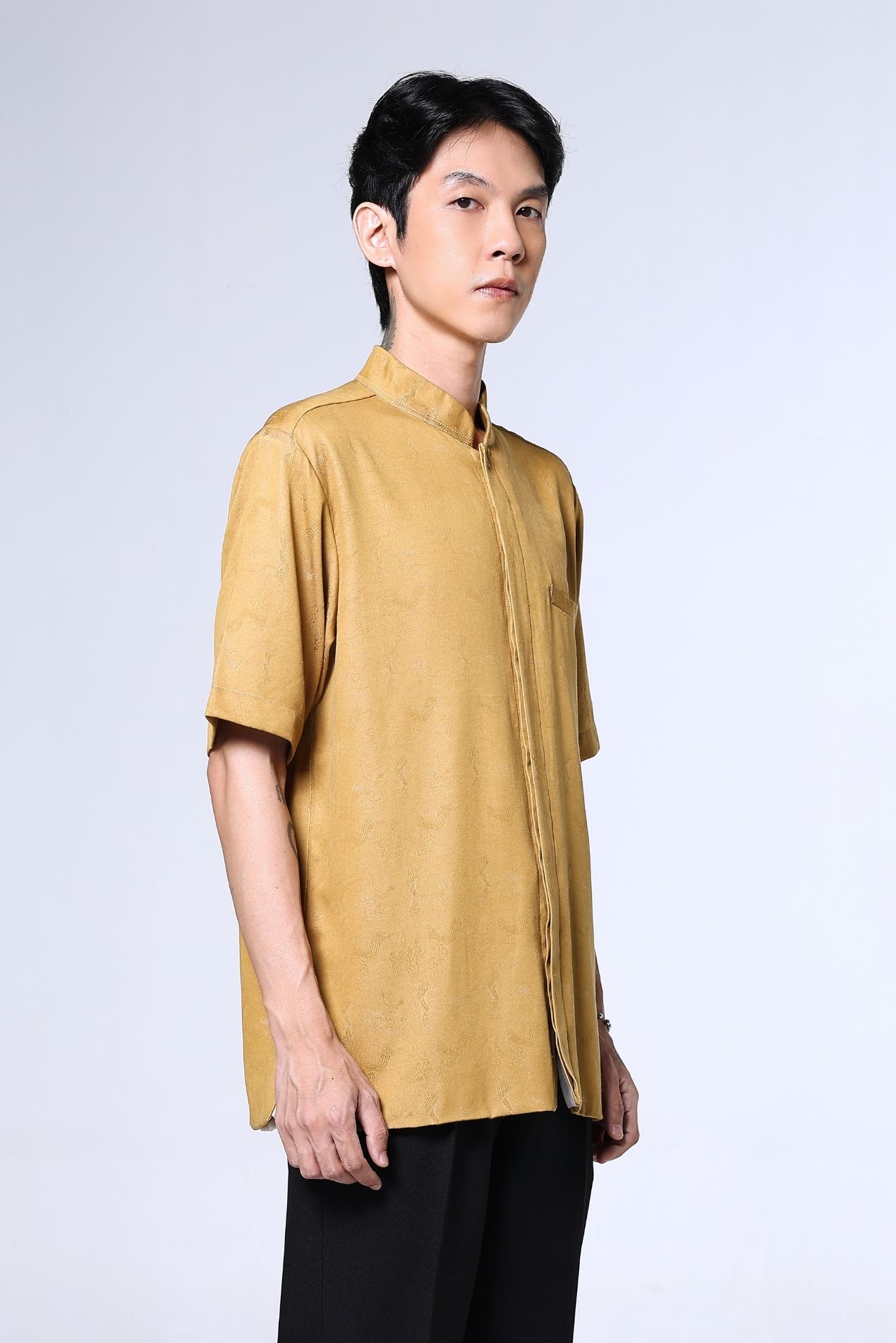 A cropped mandarin-collar top in a deep red hue, brushed with soft abstract strokes. Clean lines, a curved hem, and a sleek knot closure make it an effortless statement, timeless, refined, and subtly bold.