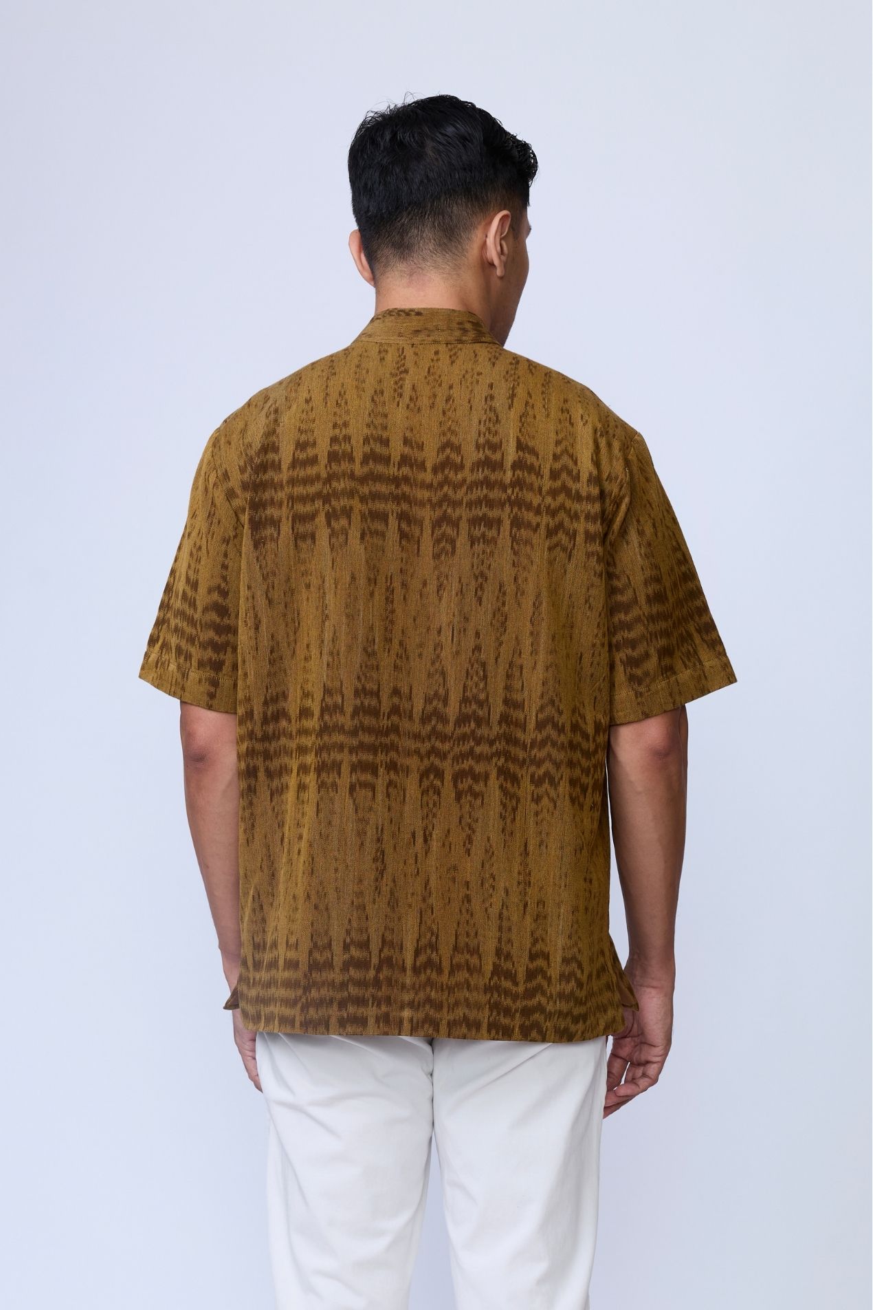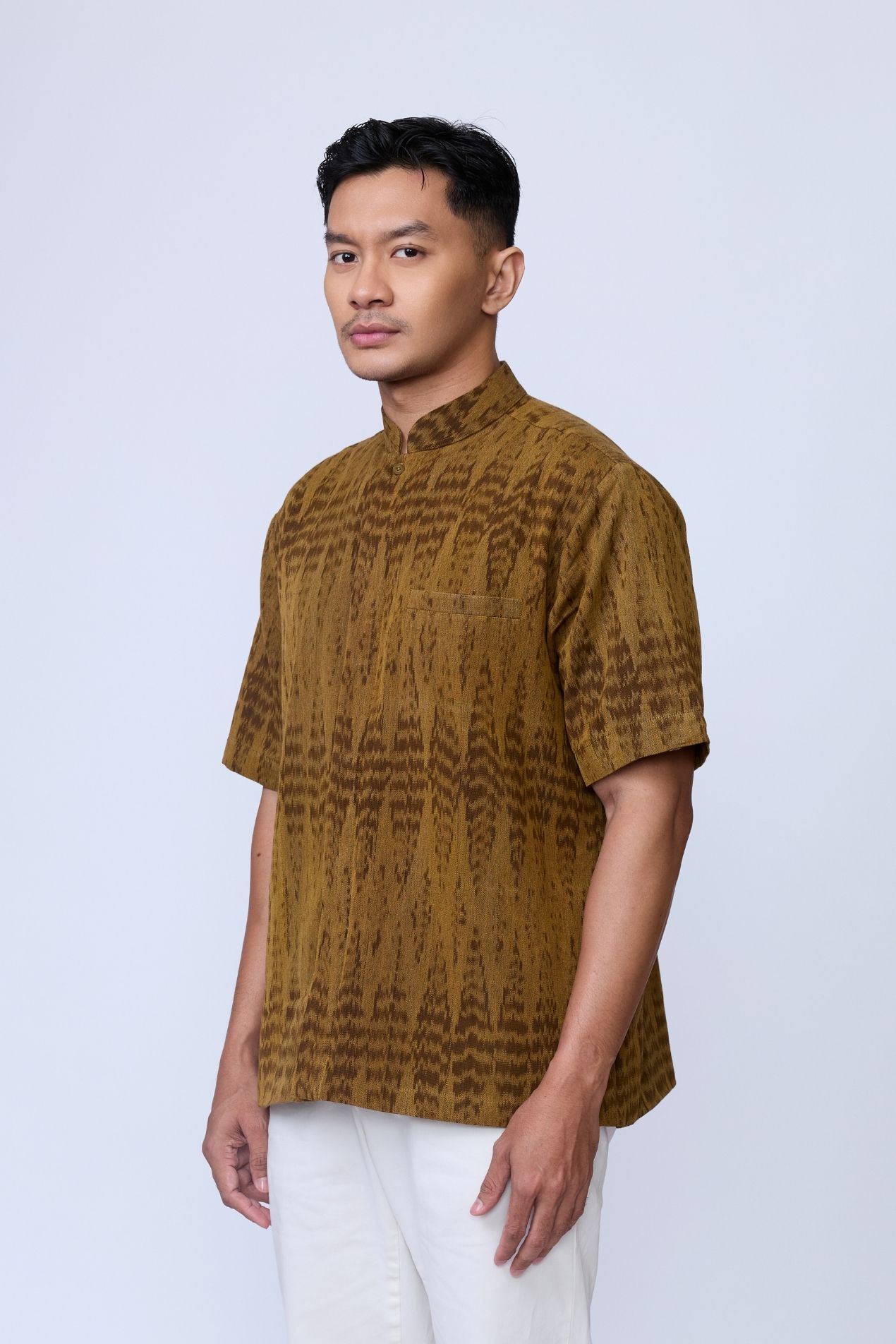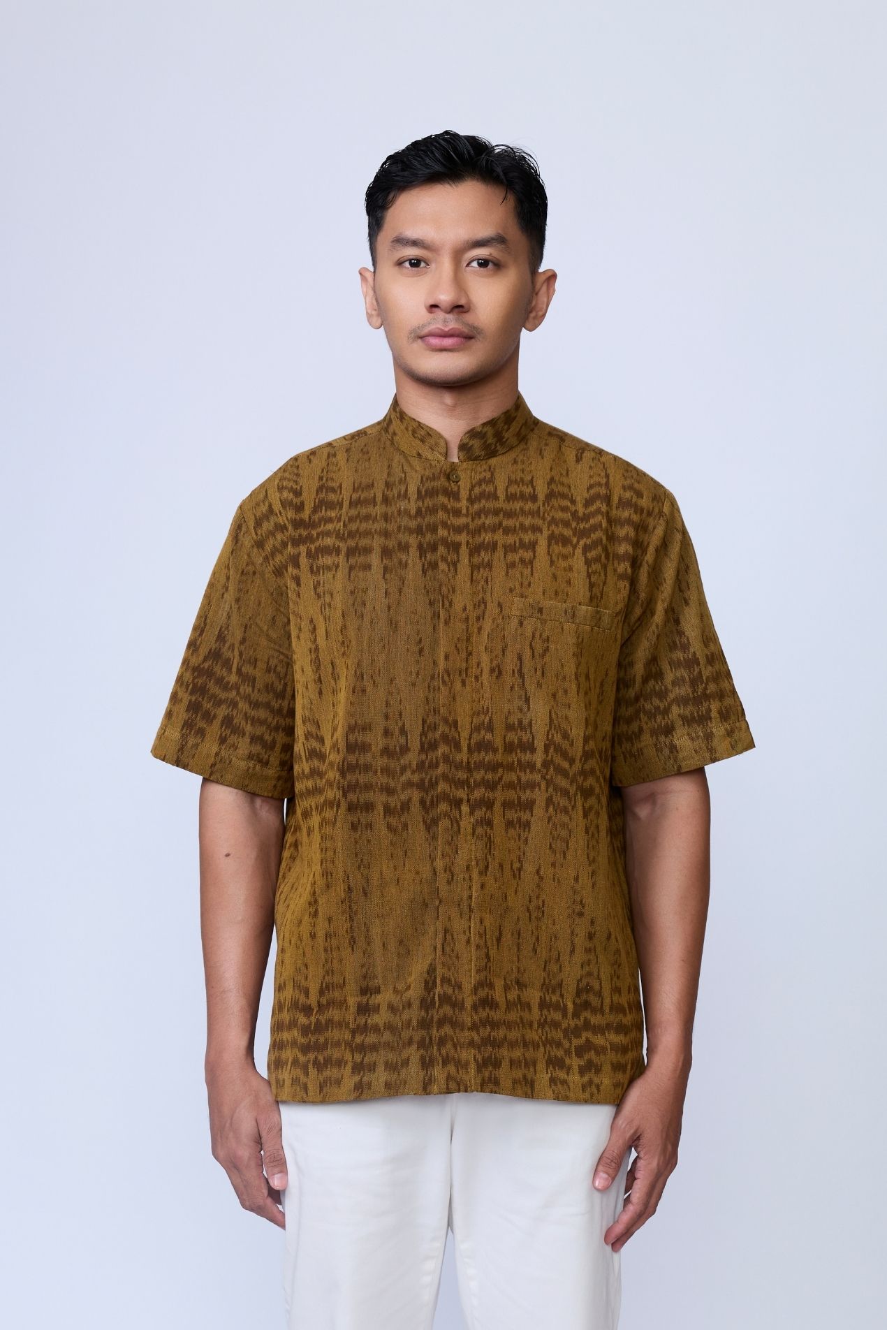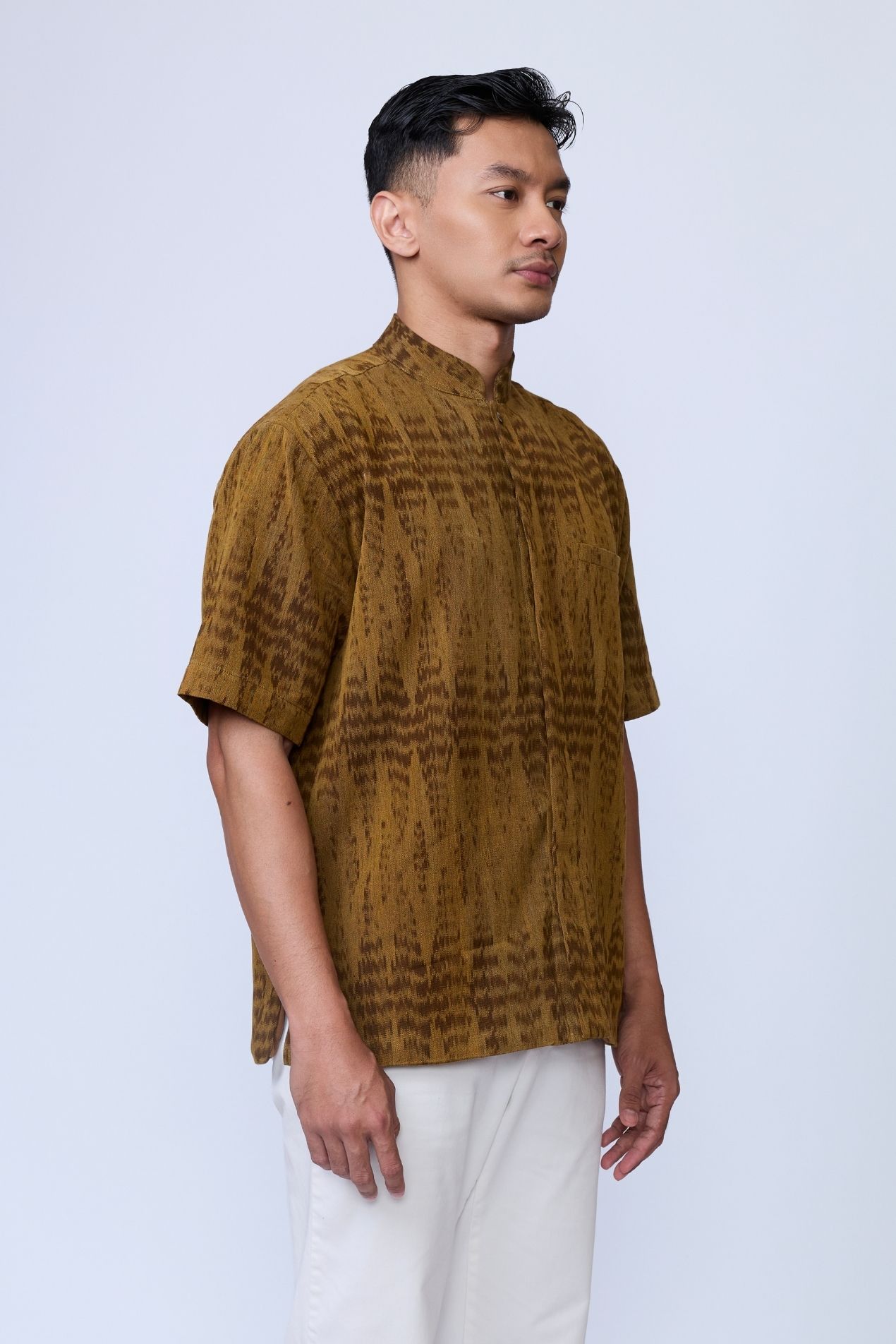 A short-sleeve top in green, designed with a neat mandarin collar and a concealed button placket for a seamless look. The structured silhouette is balanced with subtle stitching and a minimal chest detail, giving it a refined, understated edge. Polished without feeling stiff, this piece moves easily from casual days to more put-together moments.Crafted from Tenun Jepara and specially made for the Raya 2026 collection, this piece celebrates every layer of you, bold, soulful, and uniquely yours.