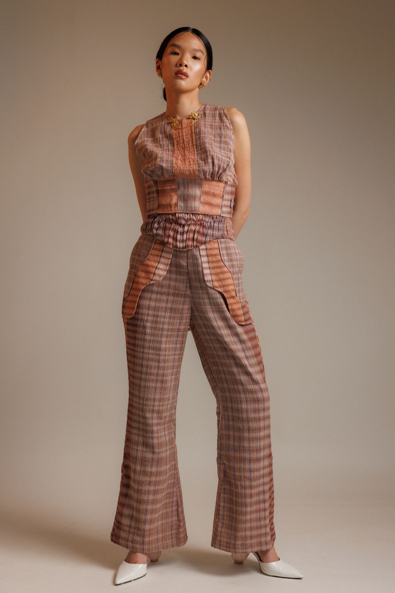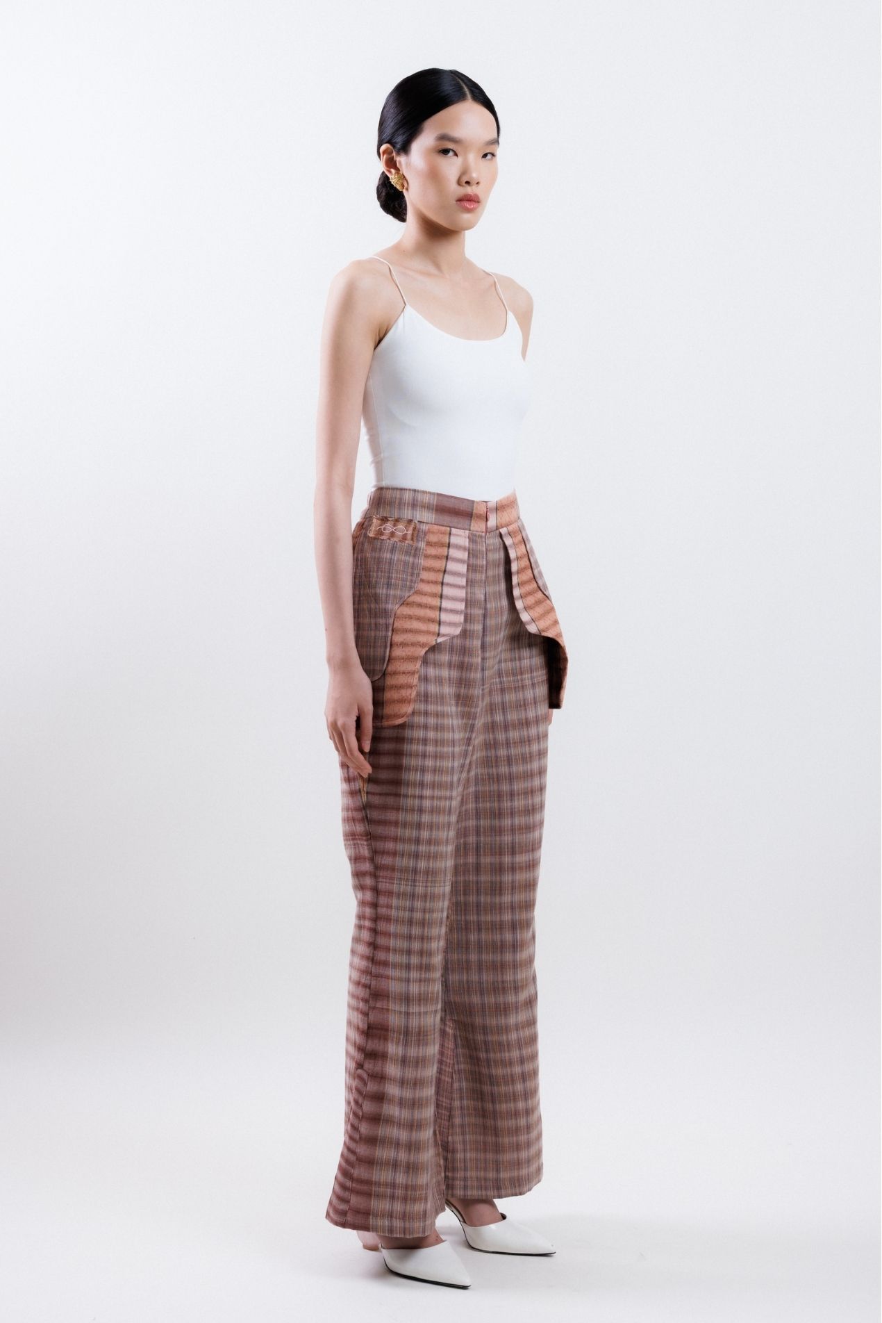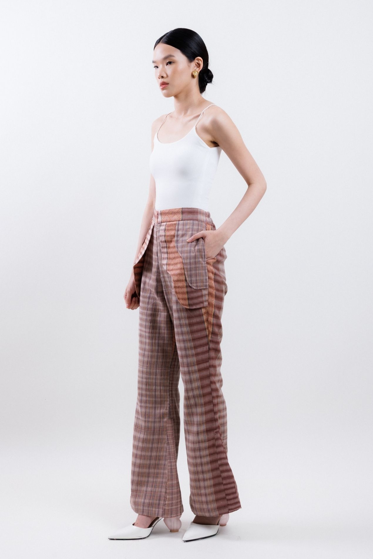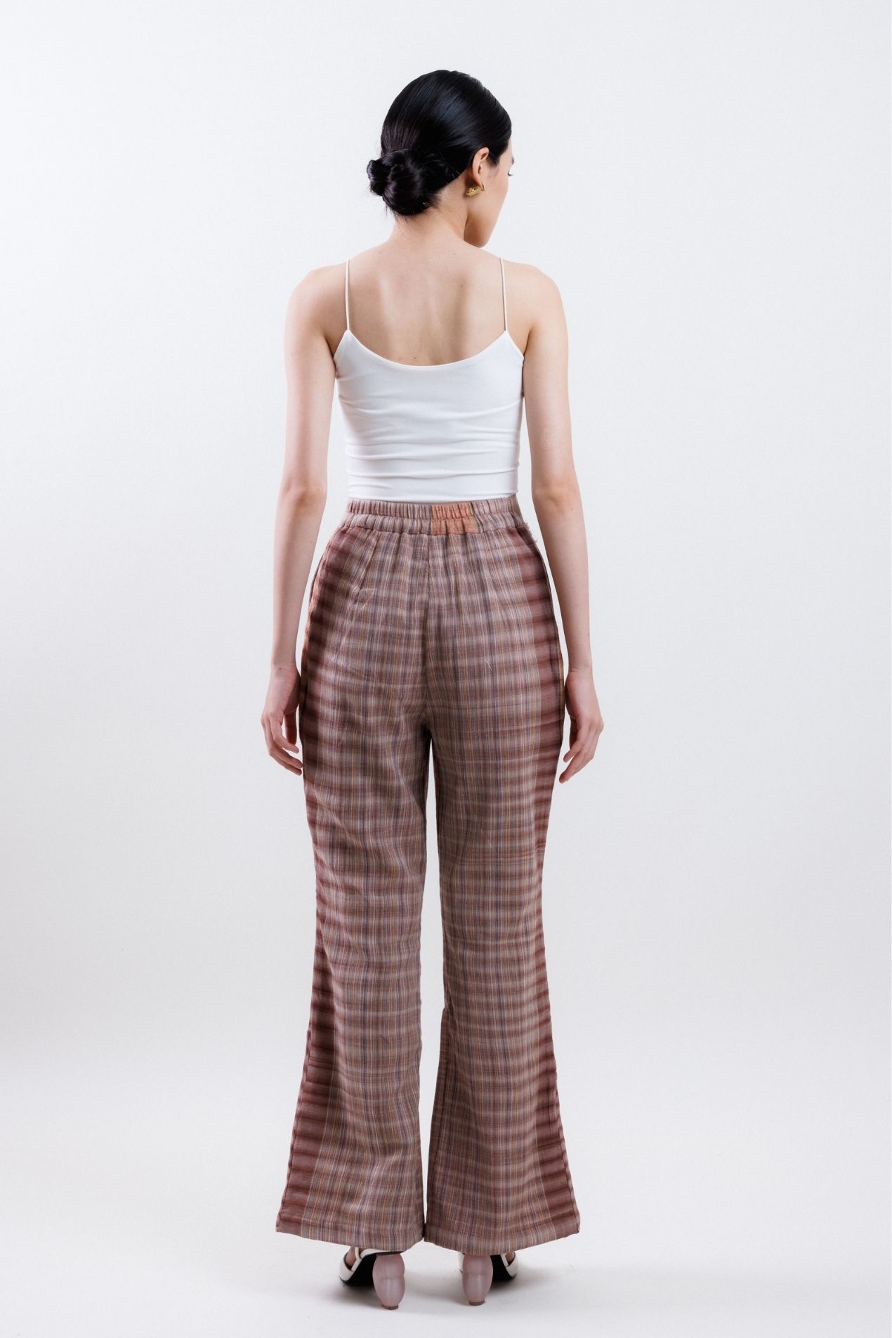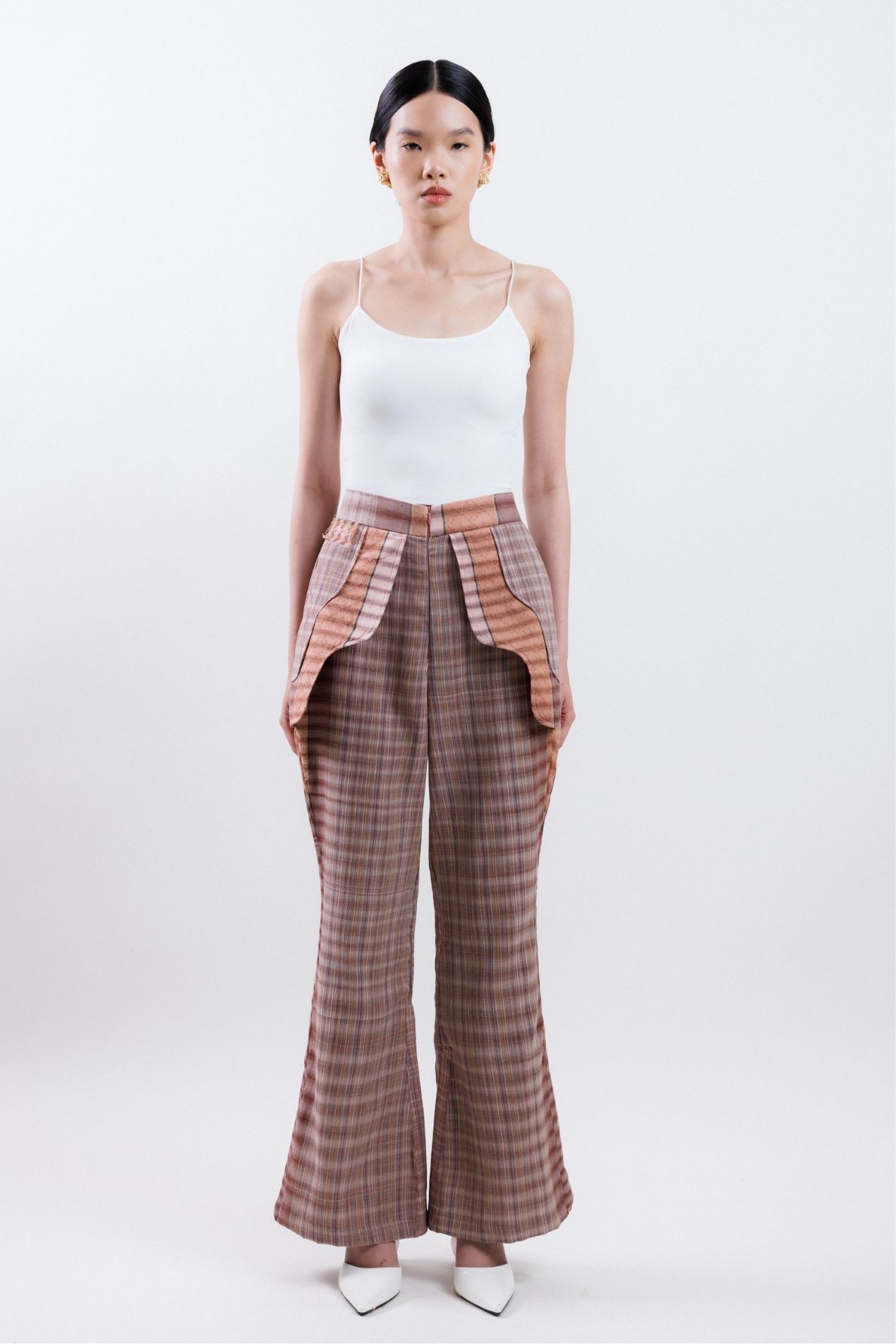 Flared pants made with the finest Tenun Tarum Bali, featuring detailed patchwork on each side, side pockets, and a zipper opening for a modern, functional design.