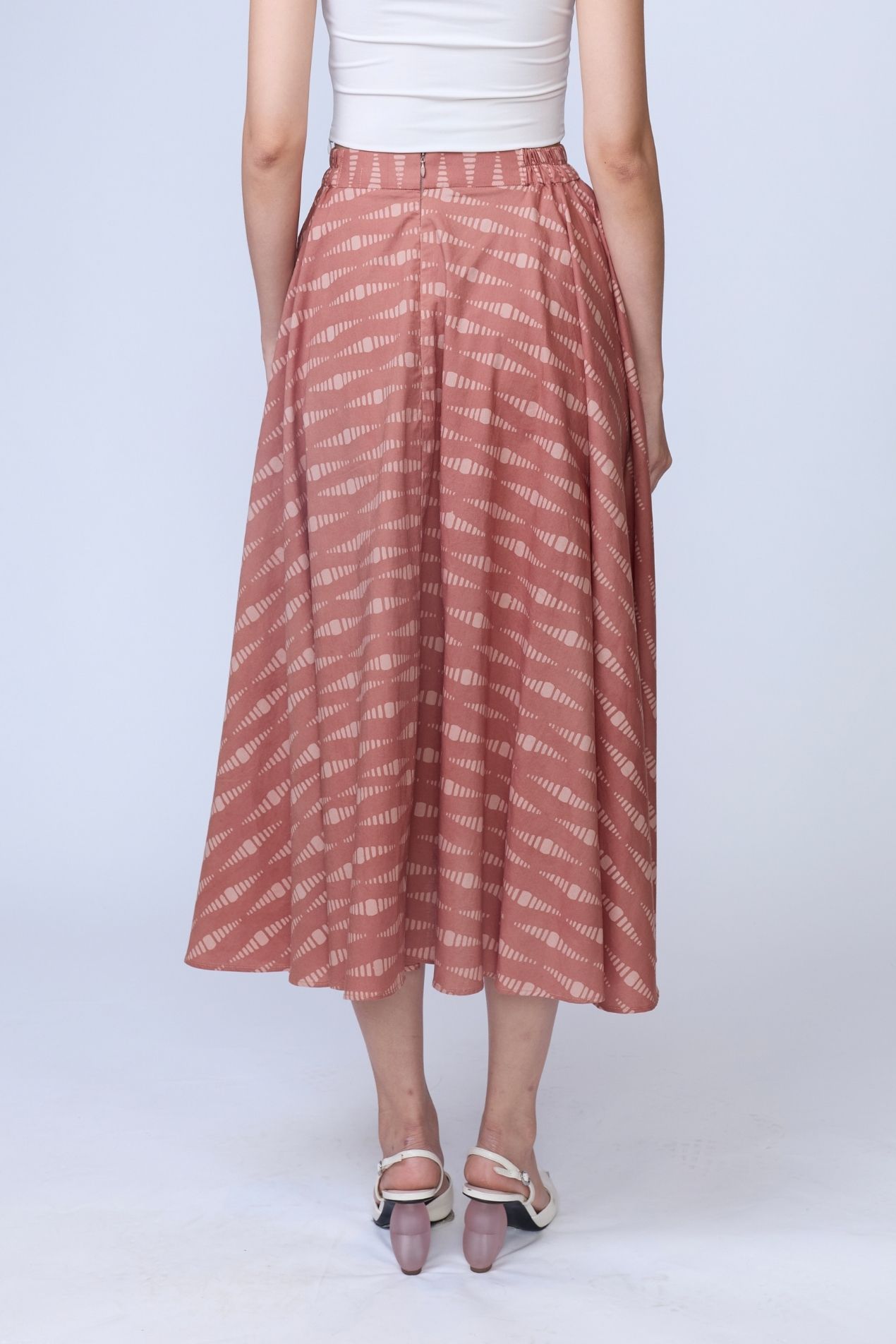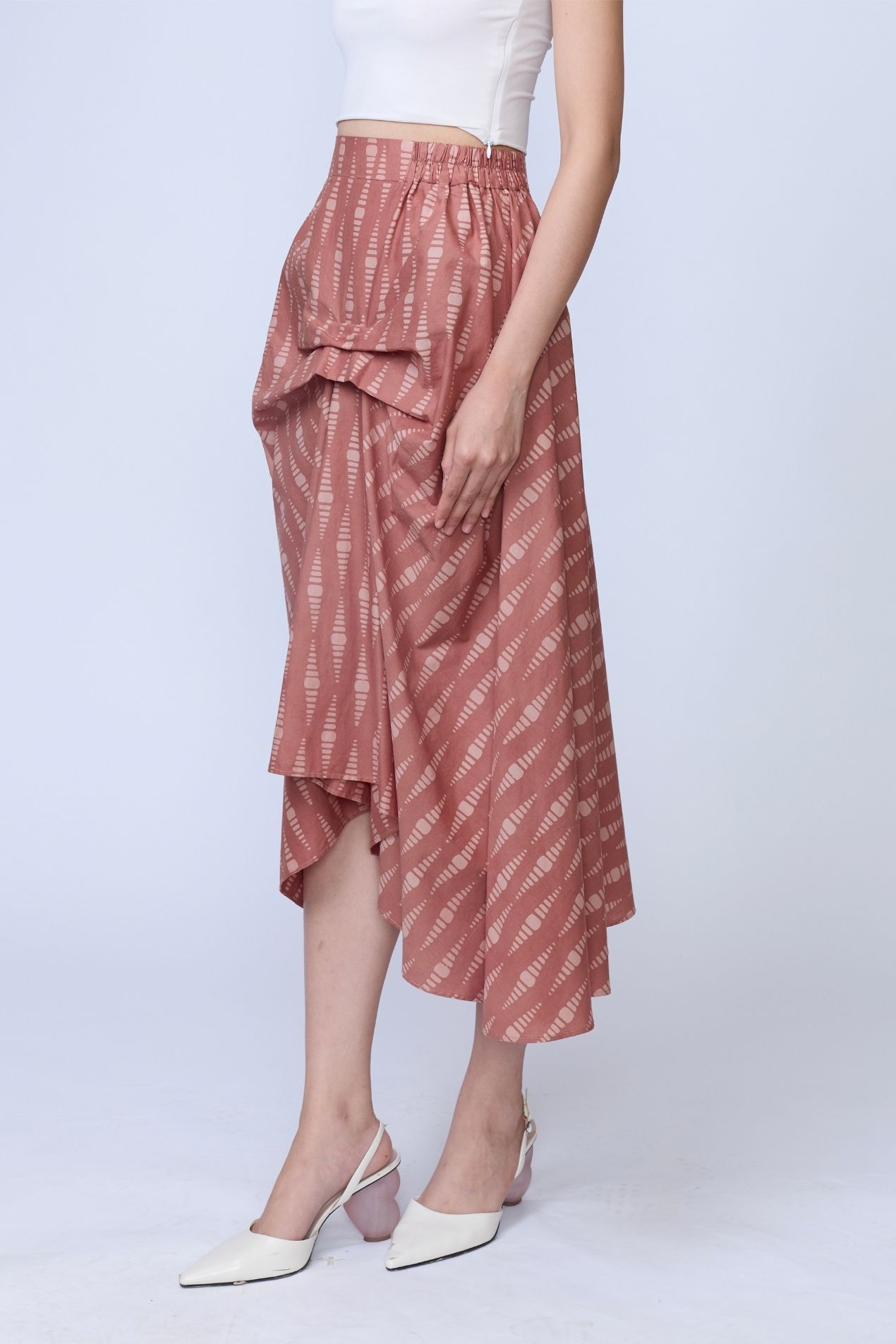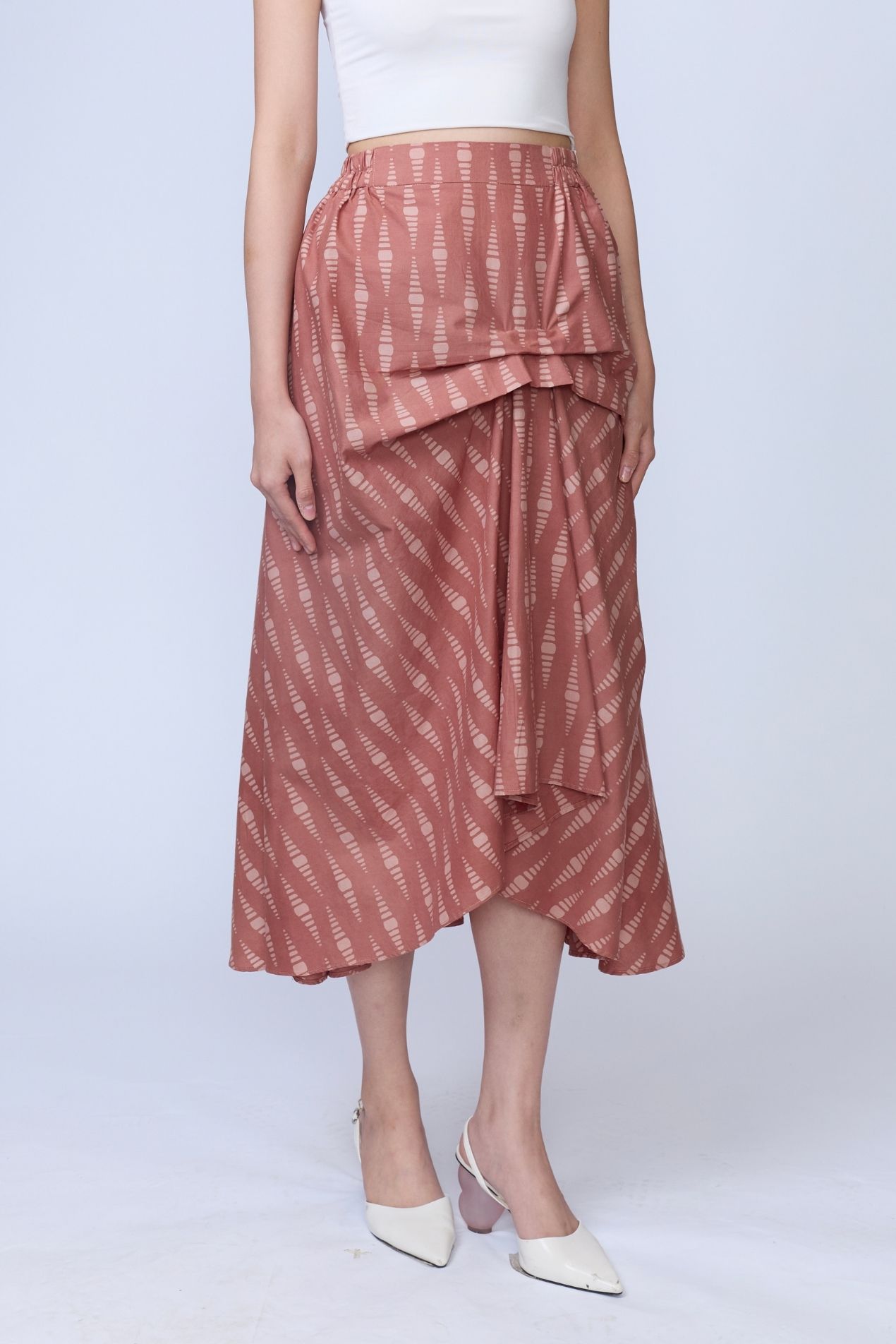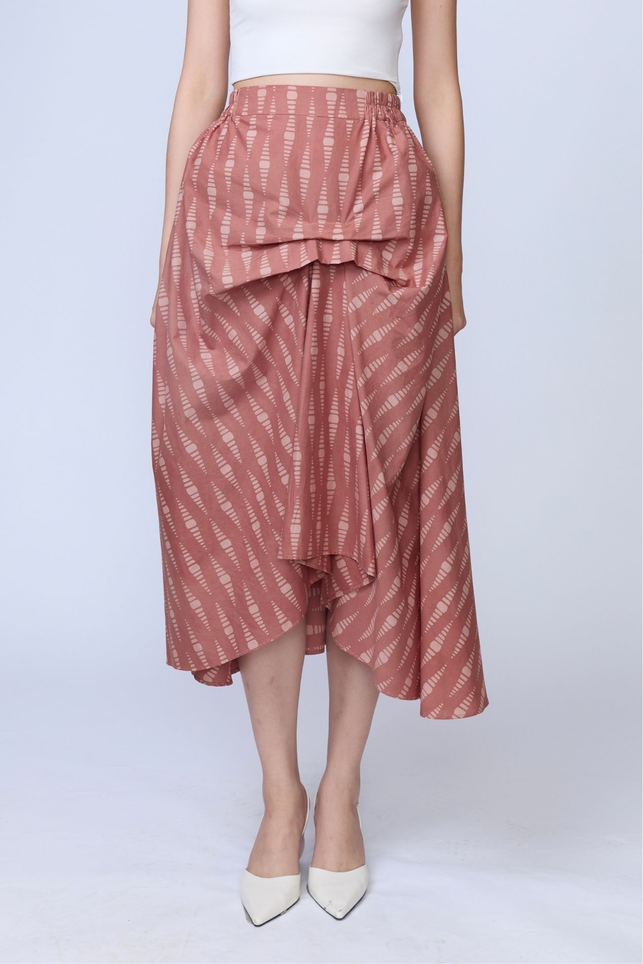 A pink asymmetrical drapery skirt with a fluid, softly structured silhouette. Designed with layered gathers that create natural movement and shape, finished with a clean waistband for a polished fit. The fabric falls effortlessly, offering ease of movement while maintaining a refined, balanced look.