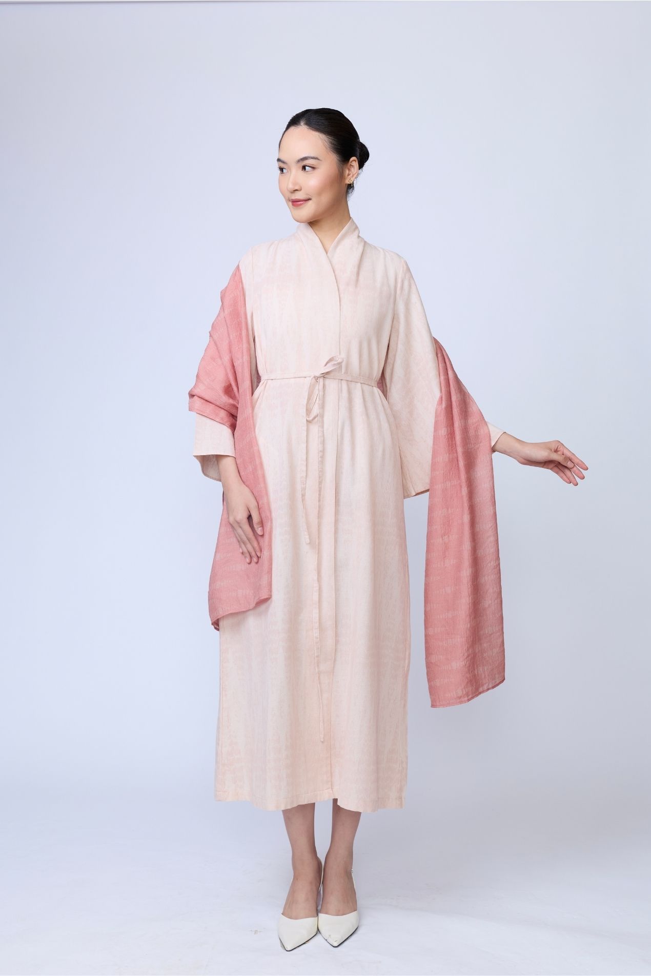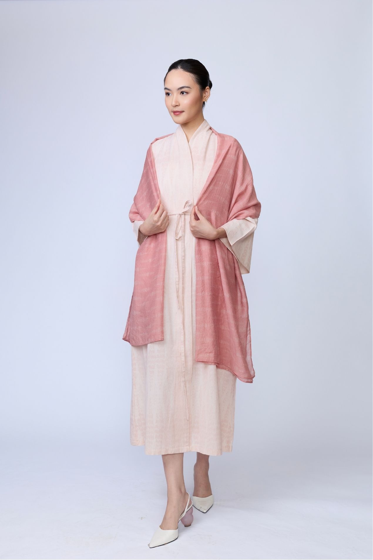 Elevate your look with this pink scarf, a single piece with endless possibilities. Wear it as a wrapped skirt, a wrapped top, a knotted outer, and beyond. An investment piece with an Indonesian twist you’ll never regret.
