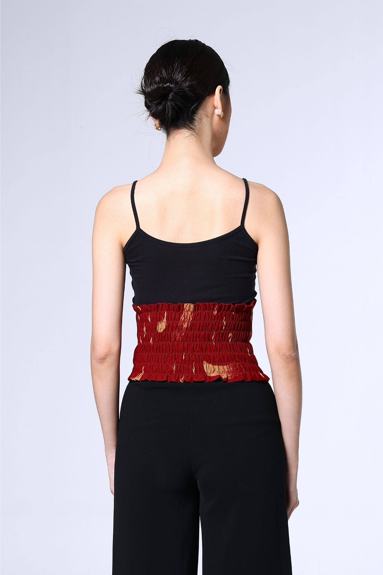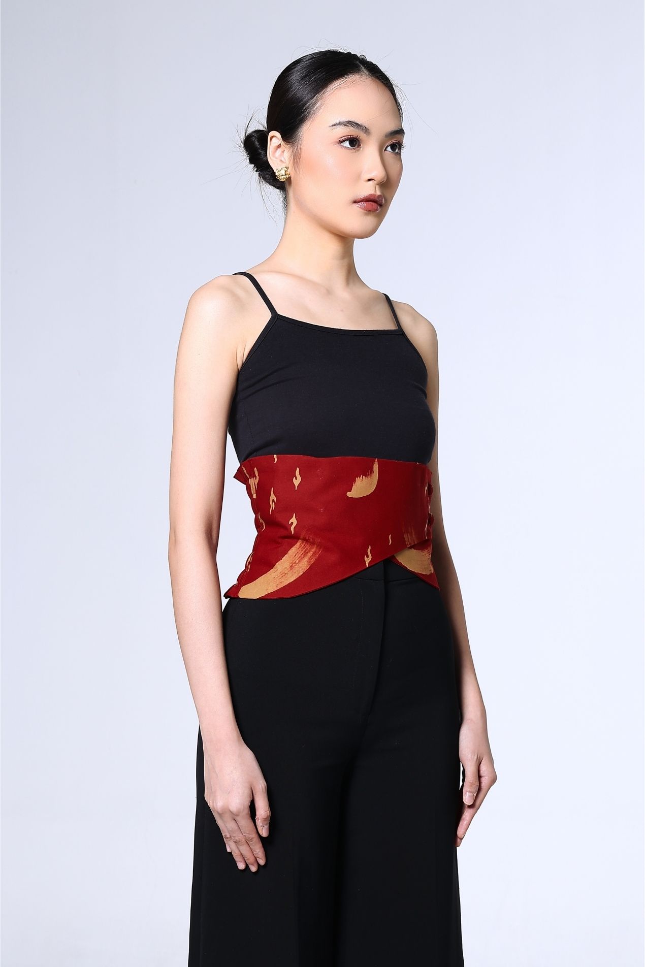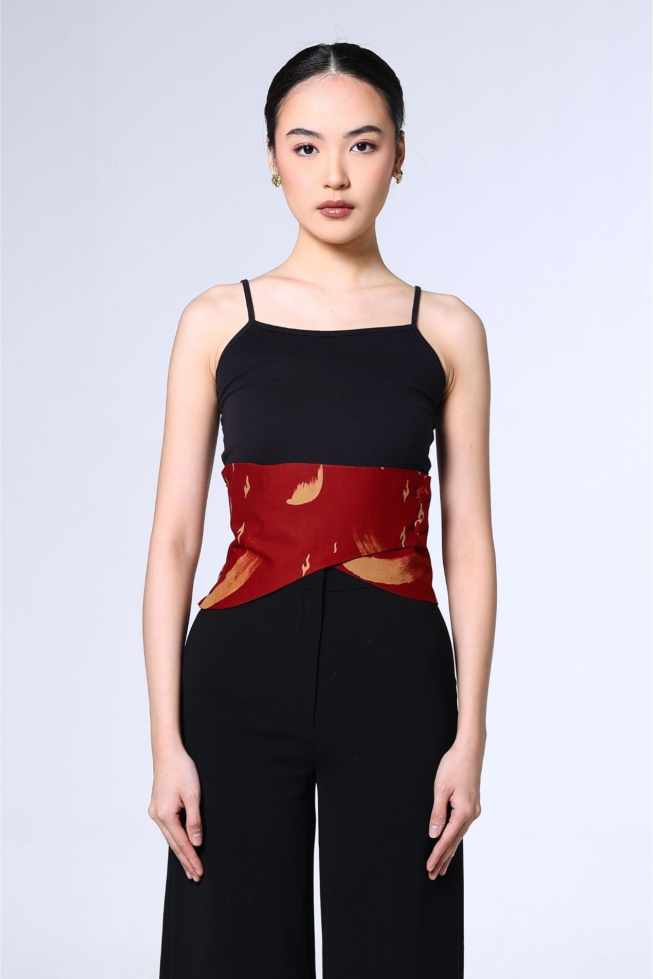 A cropped mandarin-collar top in a deep red hue, brushed with soft abstract strokes. Clean lines, a curved hem, and a sleek knot closure make it an effortless statement, timeless, refined, and subtly bold.