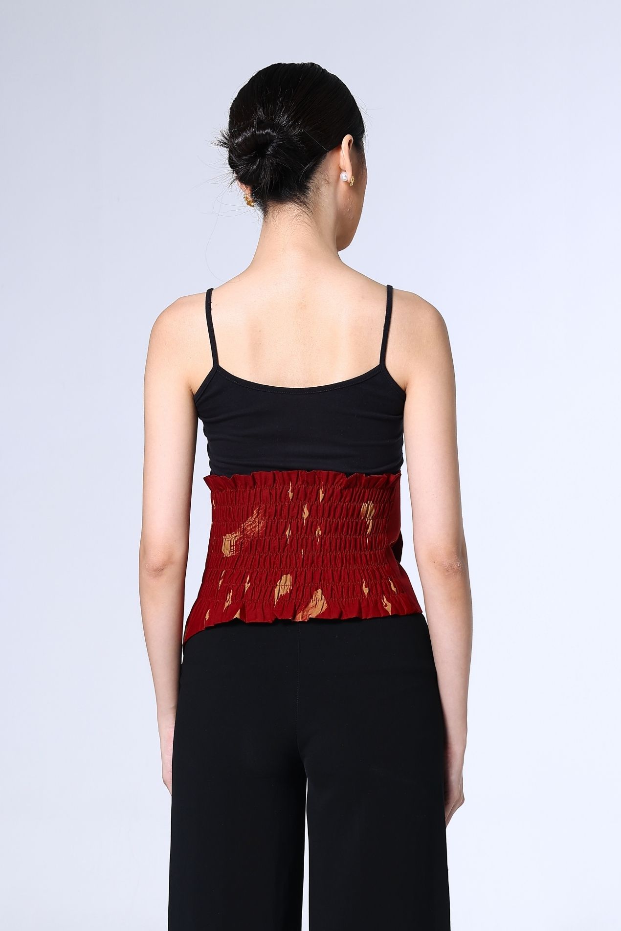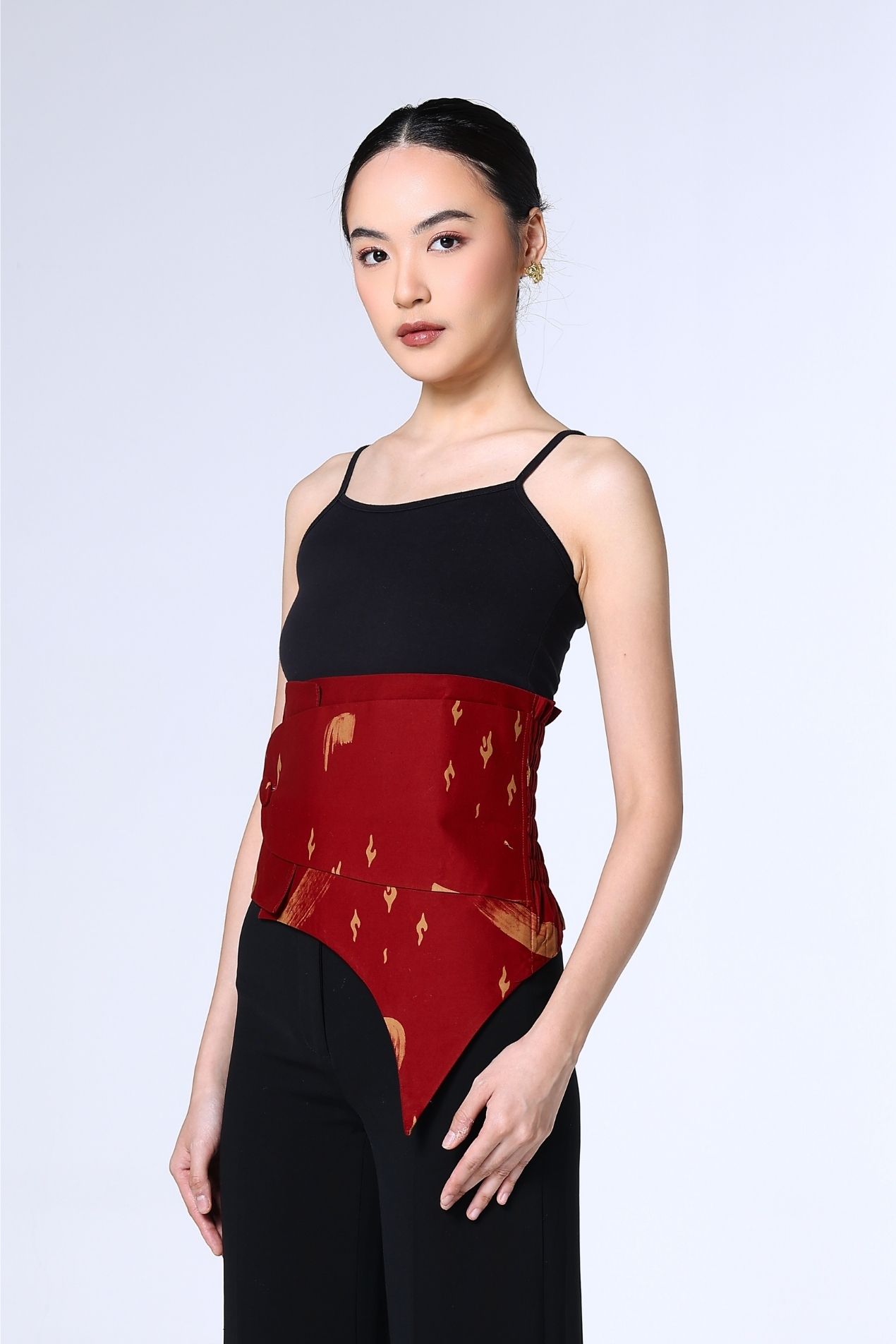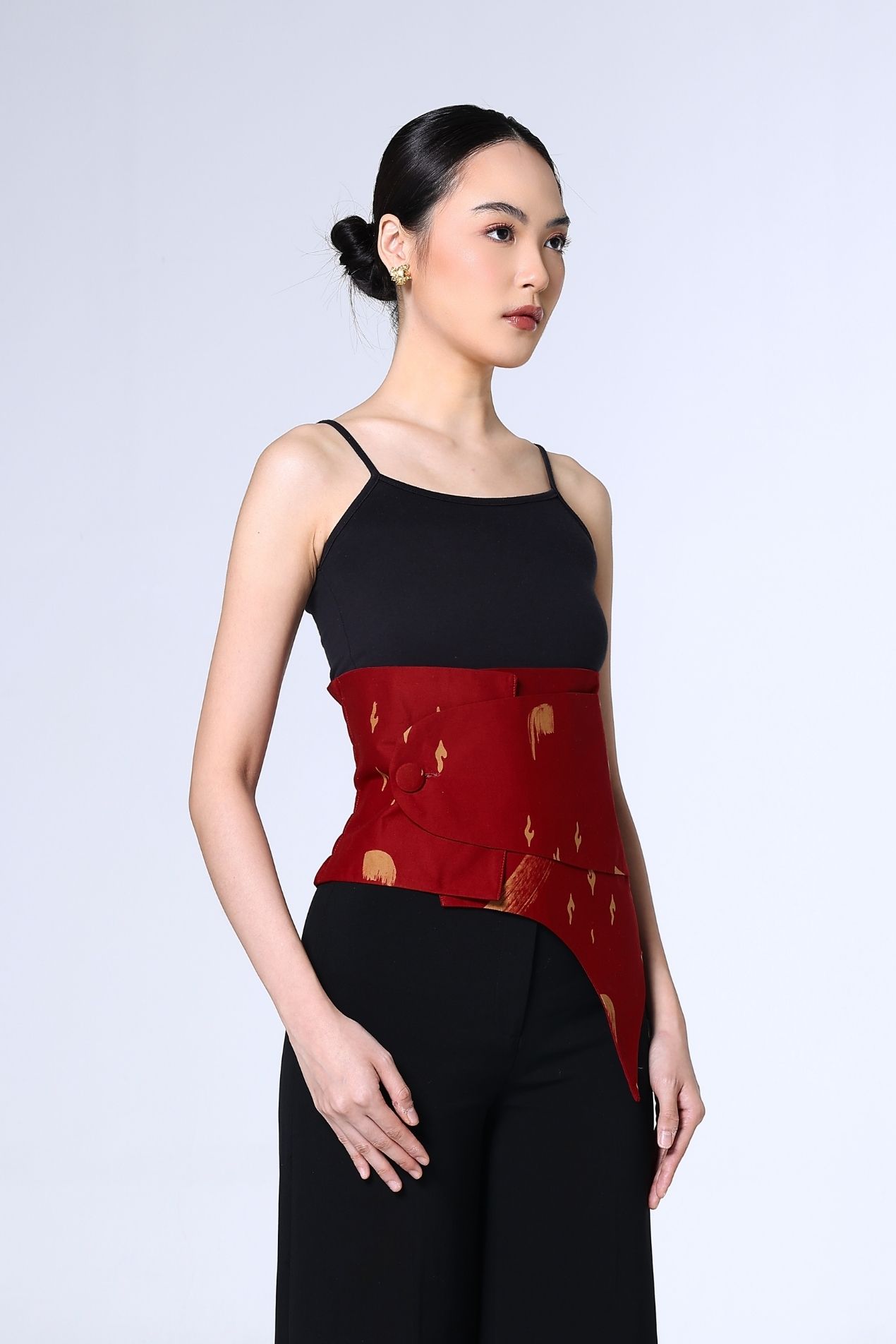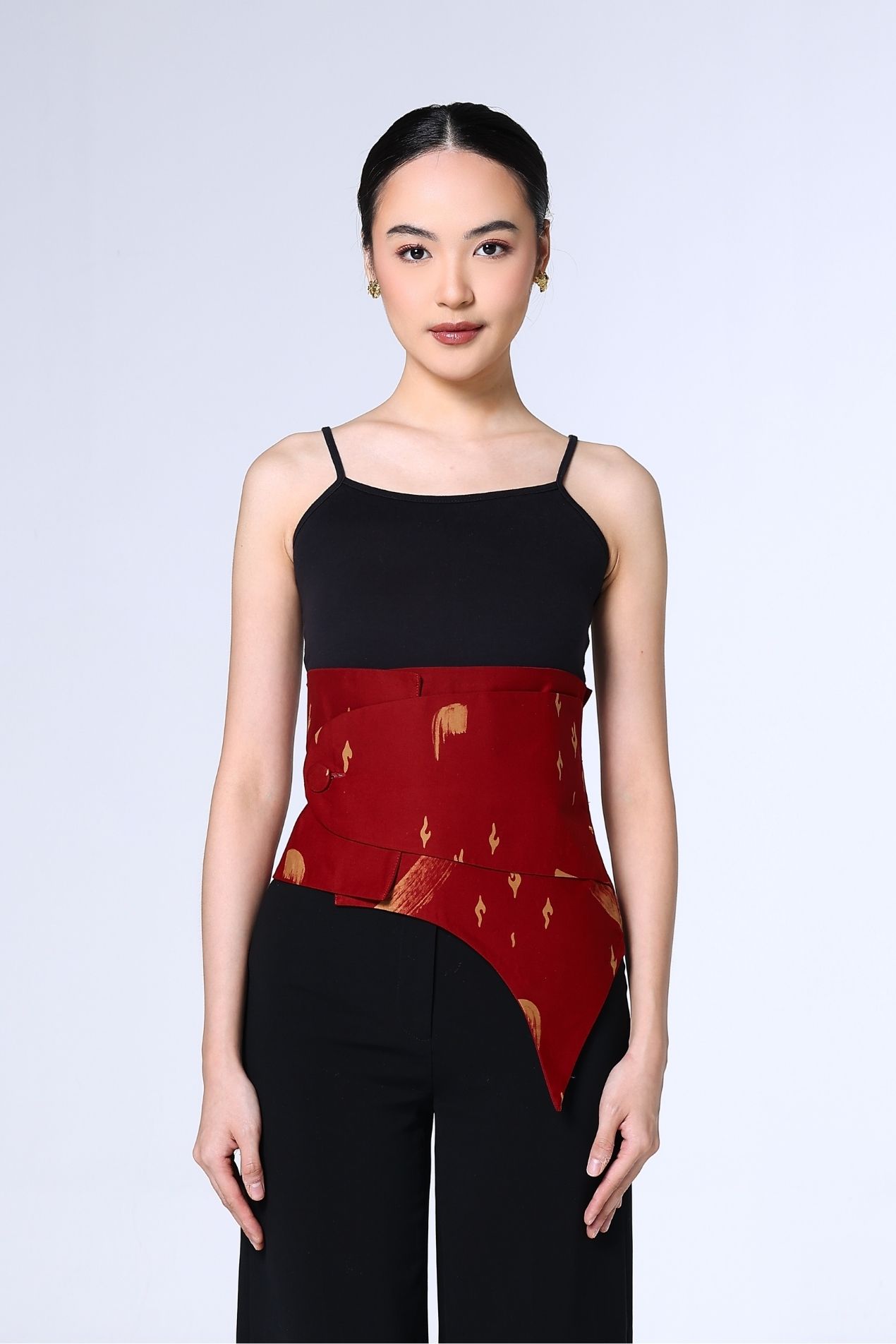 A cropped mandarin-collar top in a deep red hue, brushed with soft abstract strokes. Clean lines, a curved hem, and a sleek knot closure make it an effortless statement, timeless, refined, and subtly bold.