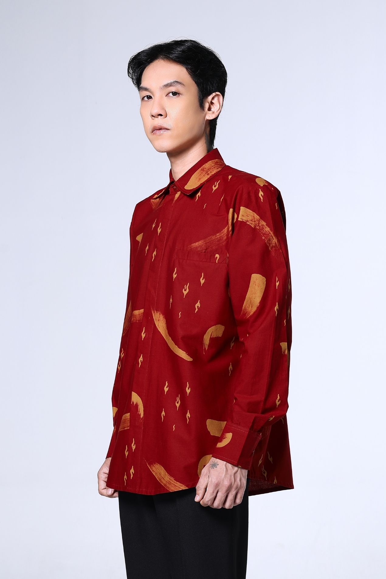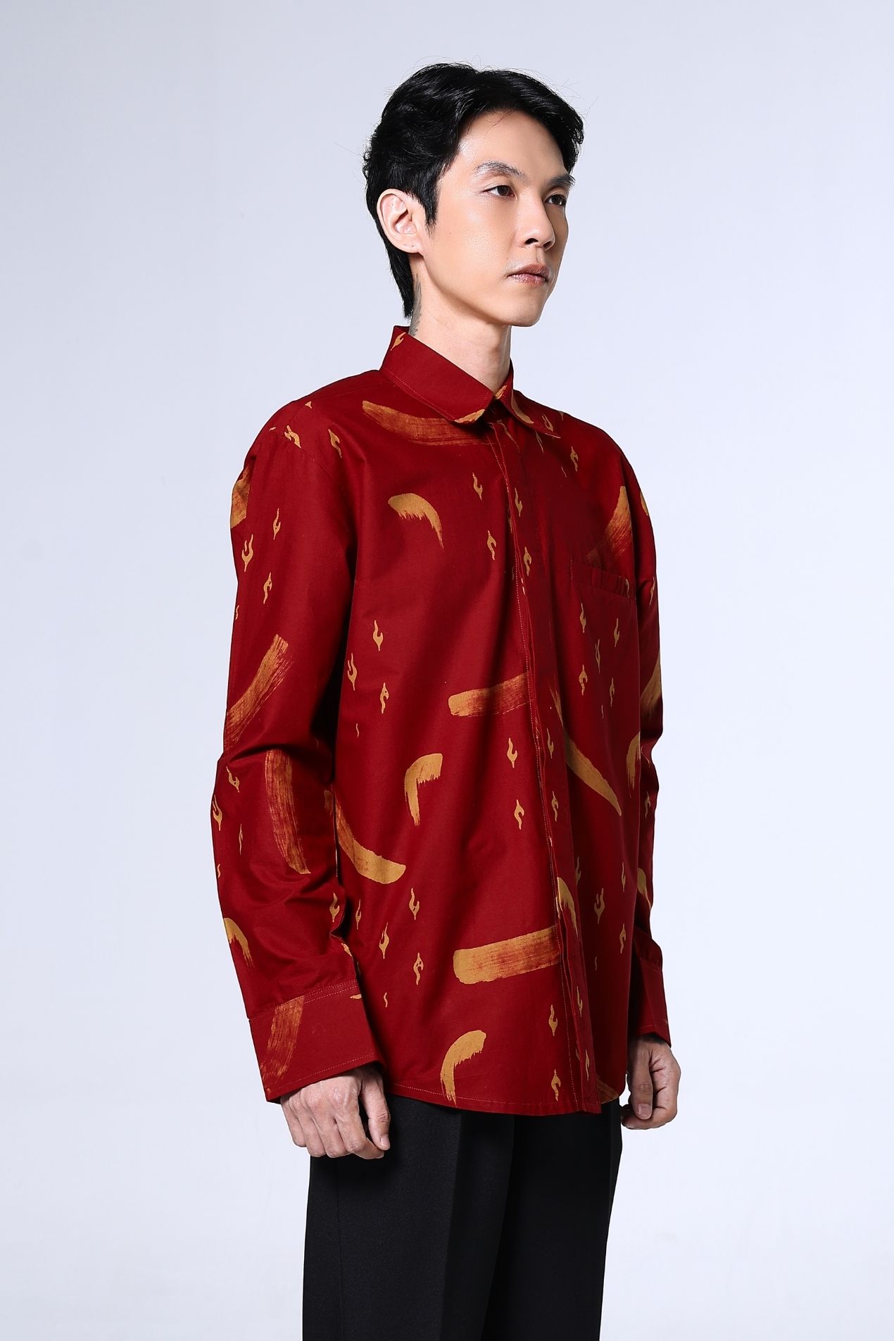 A cropped mandarin-collar top in a deep red hue, brushed with soft abstract strokes. Clean lines, a curved hem, and a sleek knot closure make it an effortless statement, timeless, refined, and subtly bold.