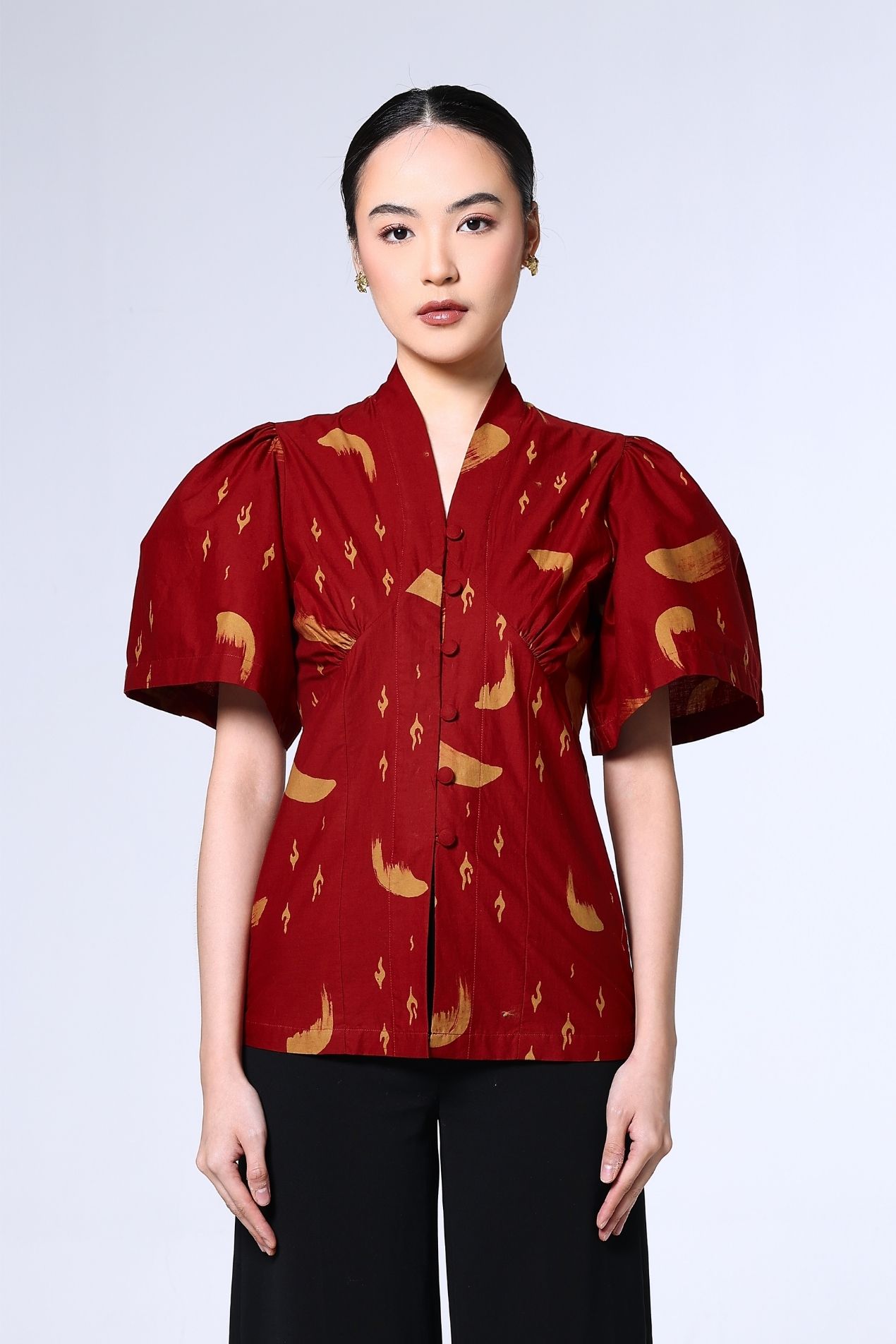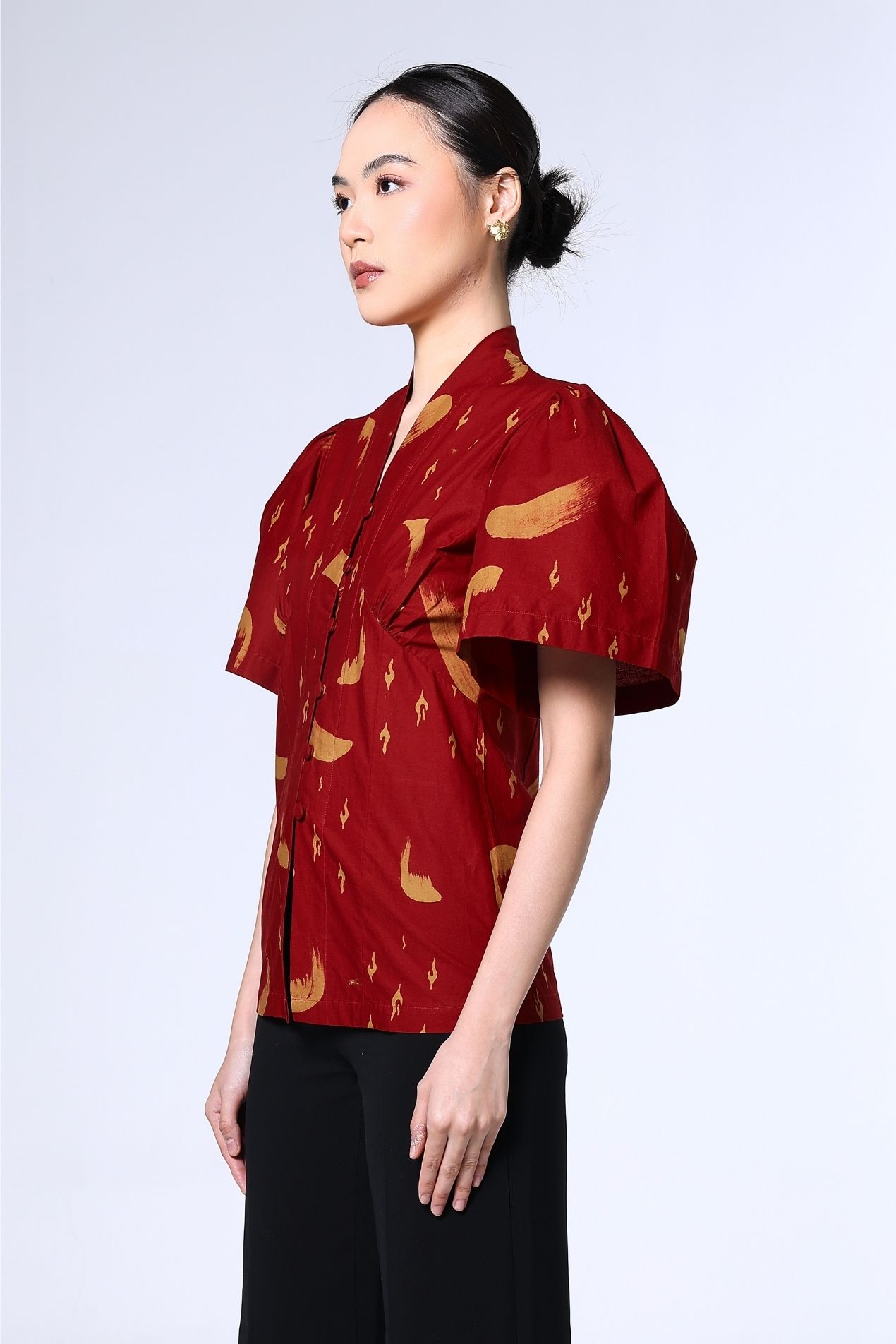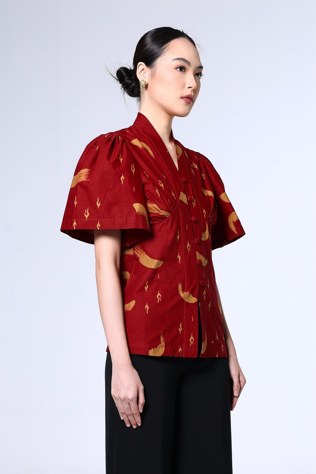 A cropped mandarin-collar top in a deep red hue, brushed with soft abstract strokes. Clean lines, a curved hem, and a sleek knot closure make it an effortless statement, timeless, refined, and subtly bold.