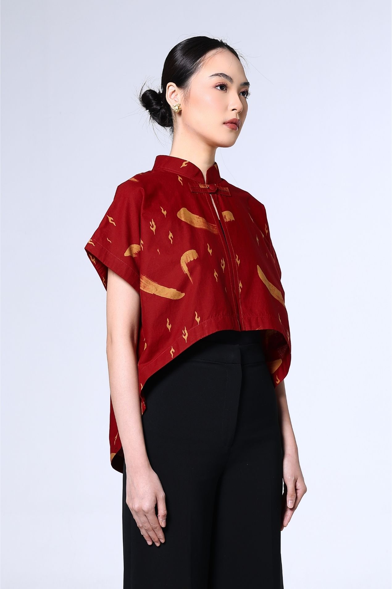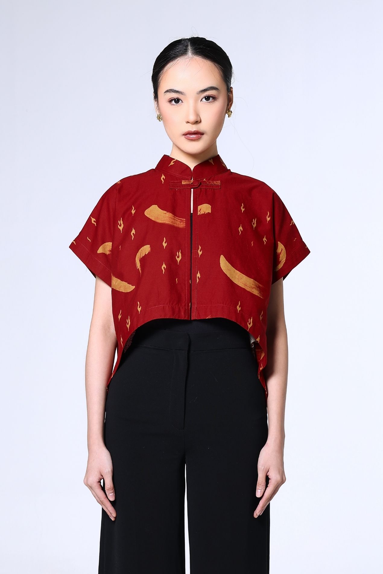 A cropped mandarin-collar top in a deep red hue, brushed with soft abstract strokes. Clean lines, a curved hem, and a sleek knot closure make it an effortless statement, timeless, refined, and subtly bold.