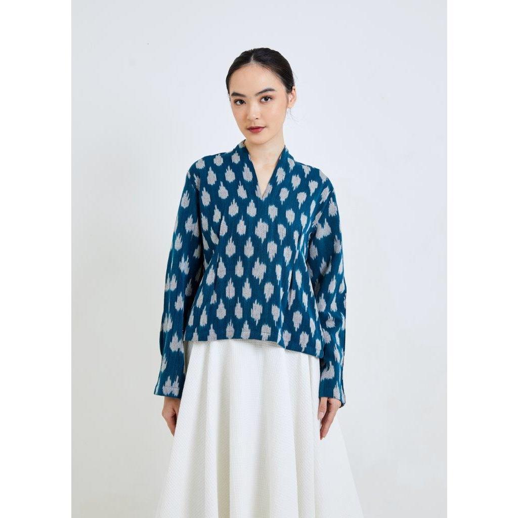 “Discover relaxed elegance in our V-neck top, featuring long sleeves and crafted from Jepara's exquisite tenun in a sophisticated turquoise.”