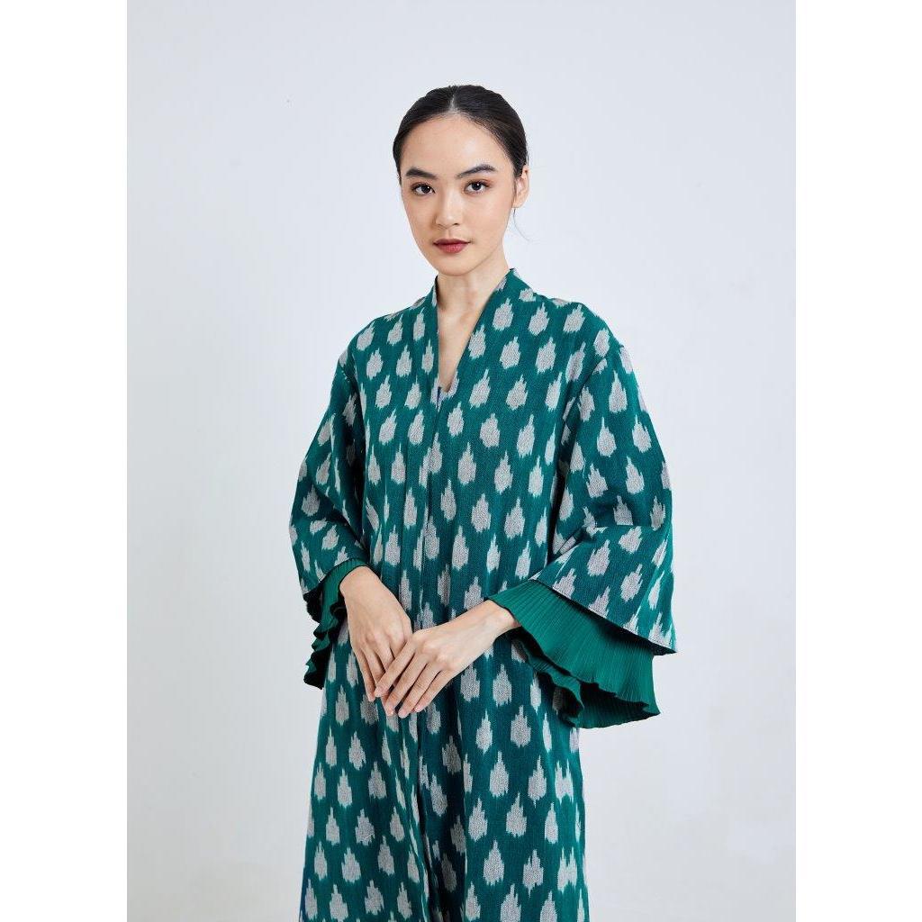 “ Step into style with our modern kaftan-inspired dress, featuring a V-neckline and double-layered sleeves that blend Jepara's tenun with pleated fabric. Crafted in a sophisticated turquoise shade, this calf-length piece exudes elegance.”