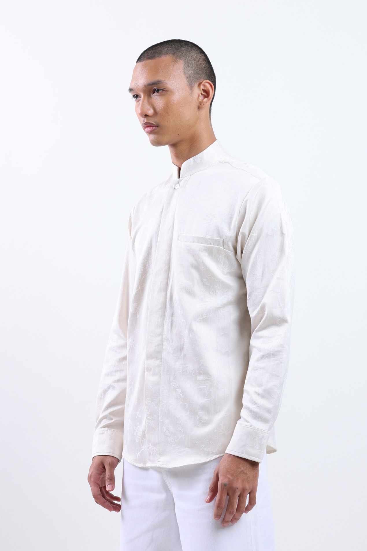Crafted from premium cotton jacquard with the distinguished akar motif, its full-length sleeves, functional front pockets, and elegant side slits ensure both sophistication and ease of movement. Perfect for celebrating Raya or elevating everyday wear, this shirt seamlessly blends comfort, tradition, and timeless style."