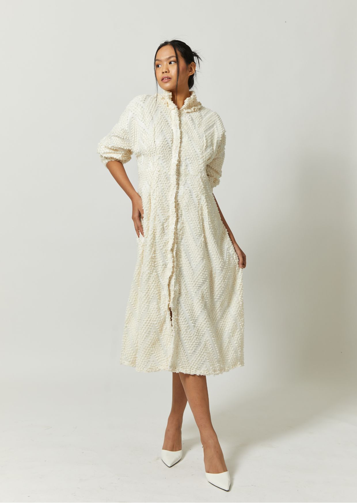 Mid dress with high neckline, 7/8 sleeves and button openings. Each piece is a masterpiece, skillfully made by Indonesian artisans with generations of expertise, using Jepara’s tenun baron.