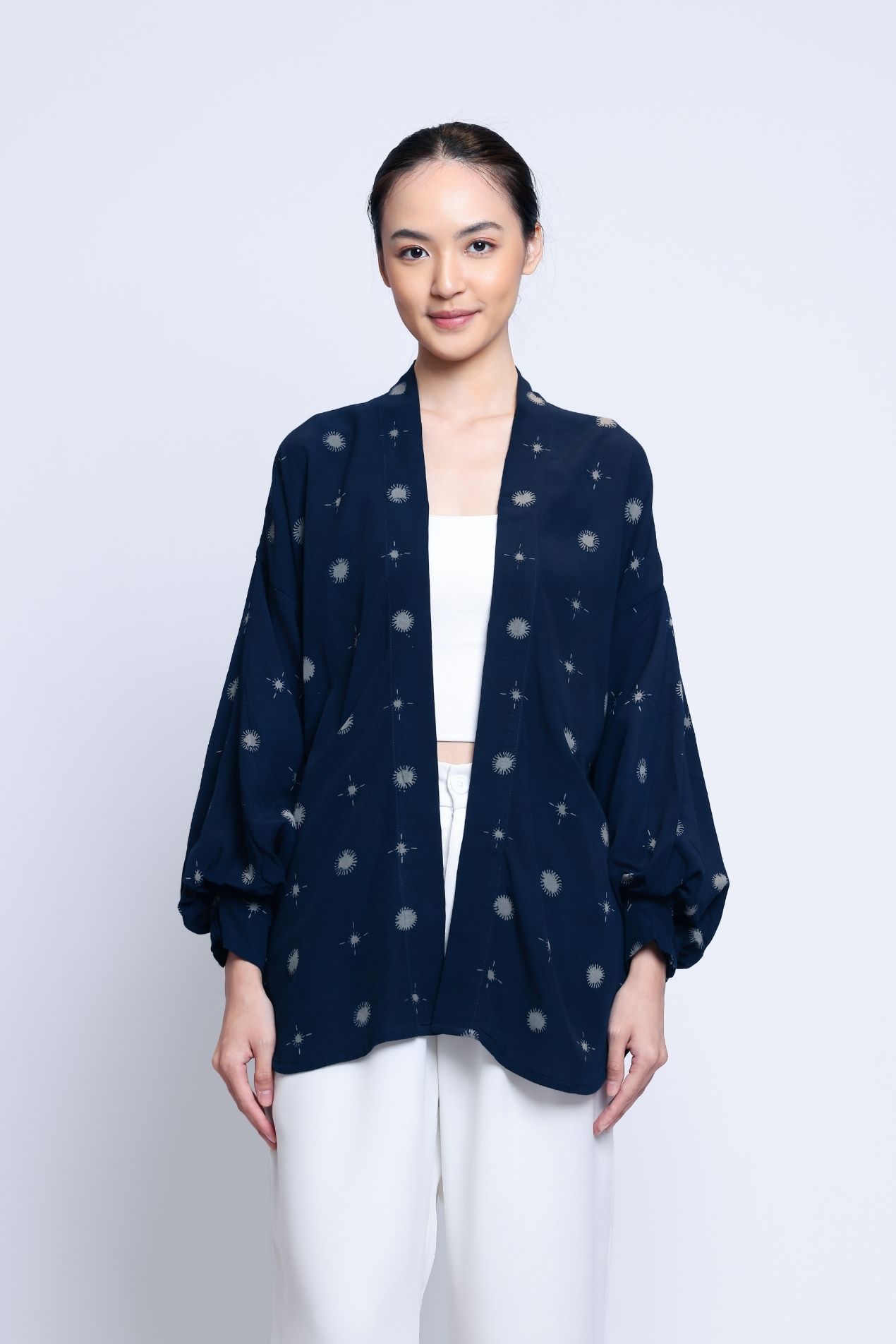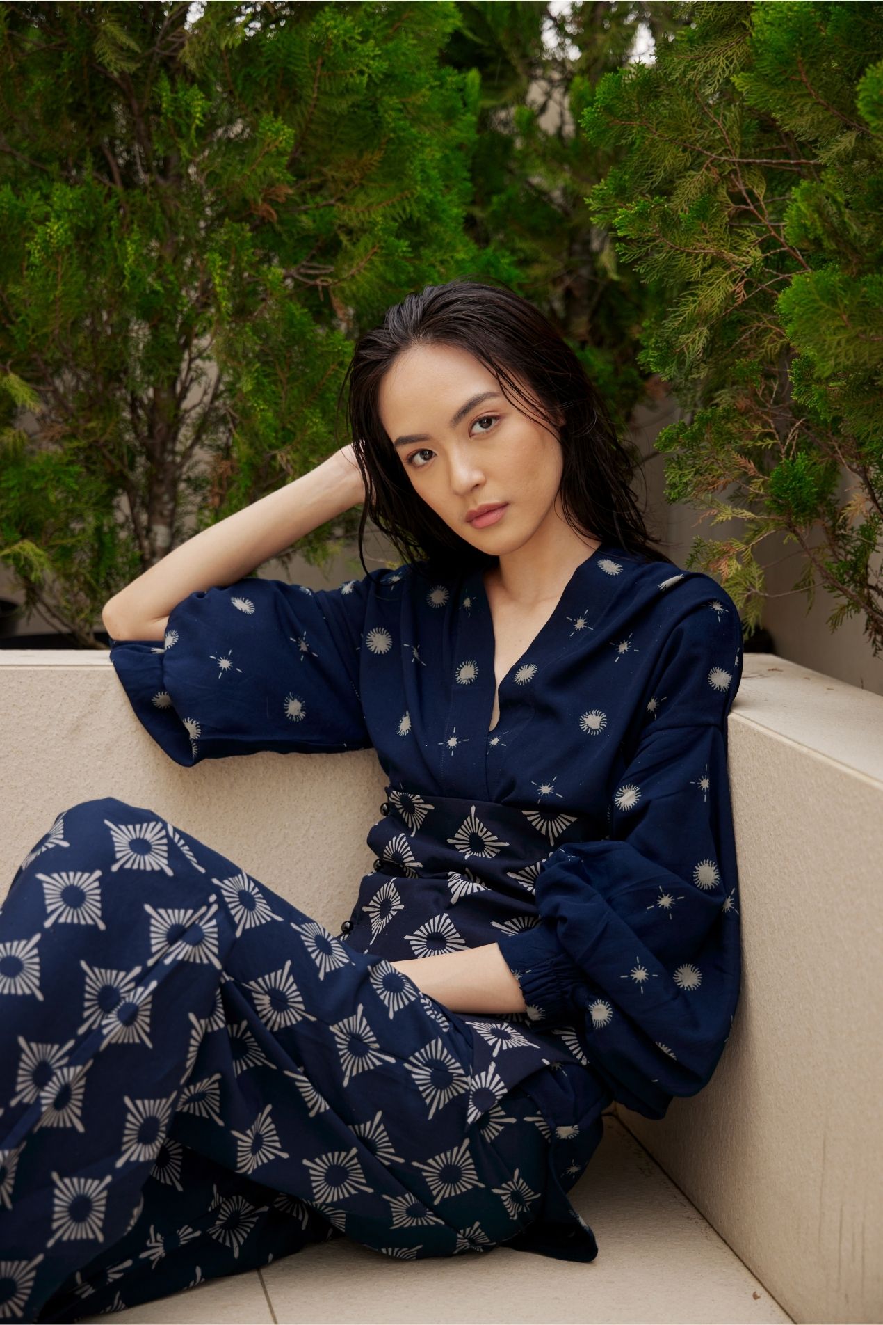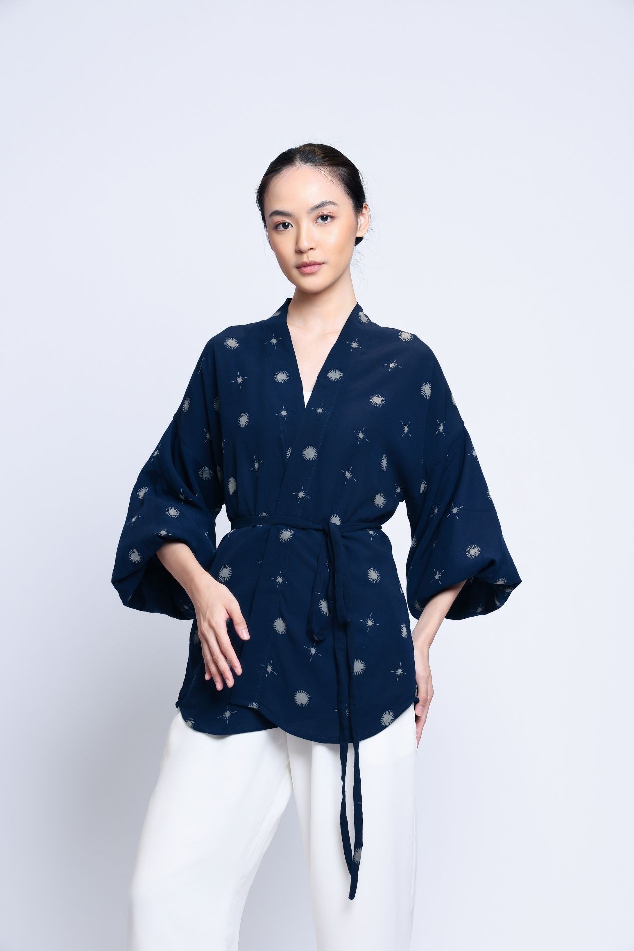 "A lightweight kimono-style outer with adjustable ties that can be worn loose or cinched at the waist to suit your mood. Perfect for layering over a dress or your go-to tank top, it adds just the right touch of effortlessness while still feeling dressed up. The long sleeves can be gently ruched to the elbows for a relaxed yet polished look.