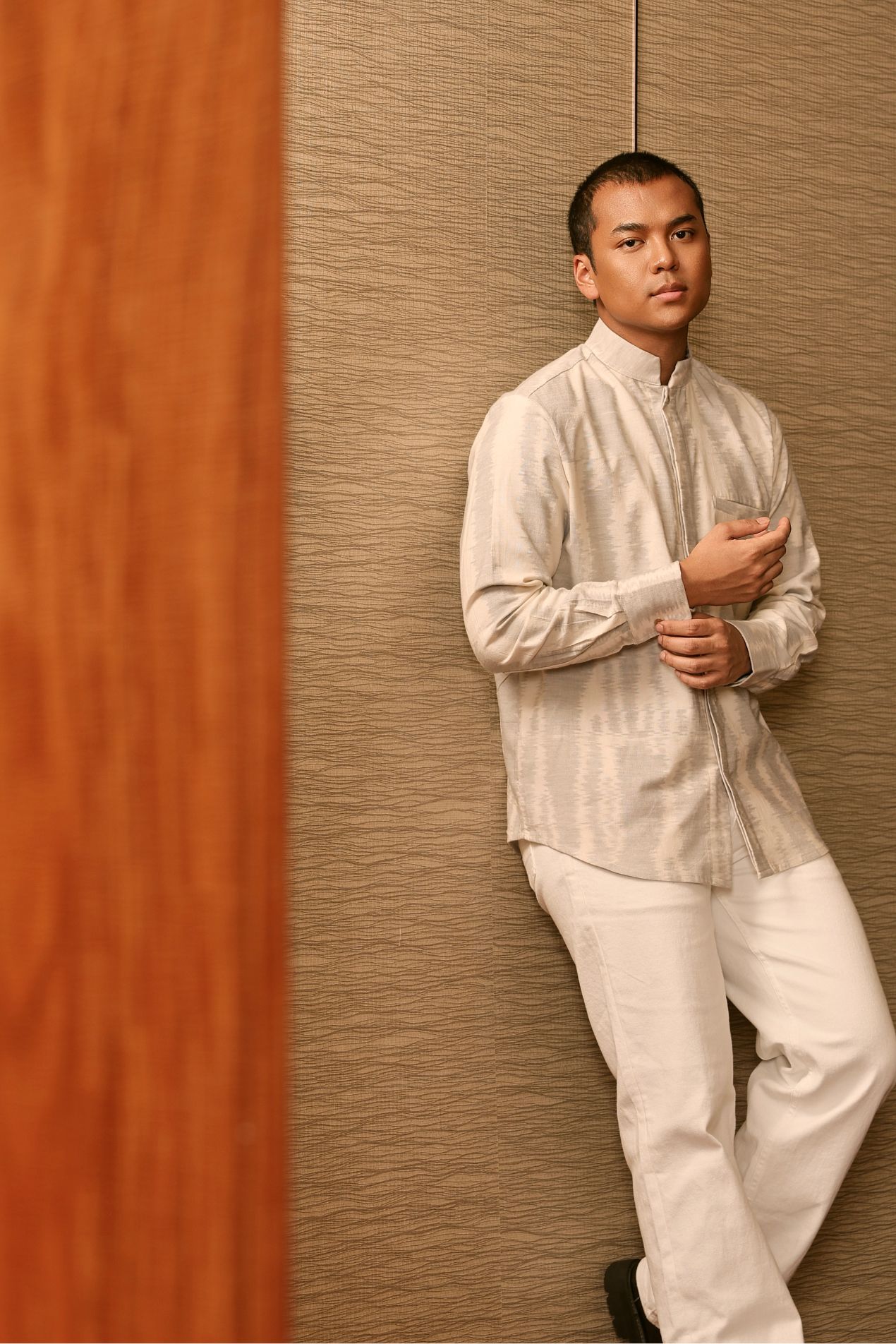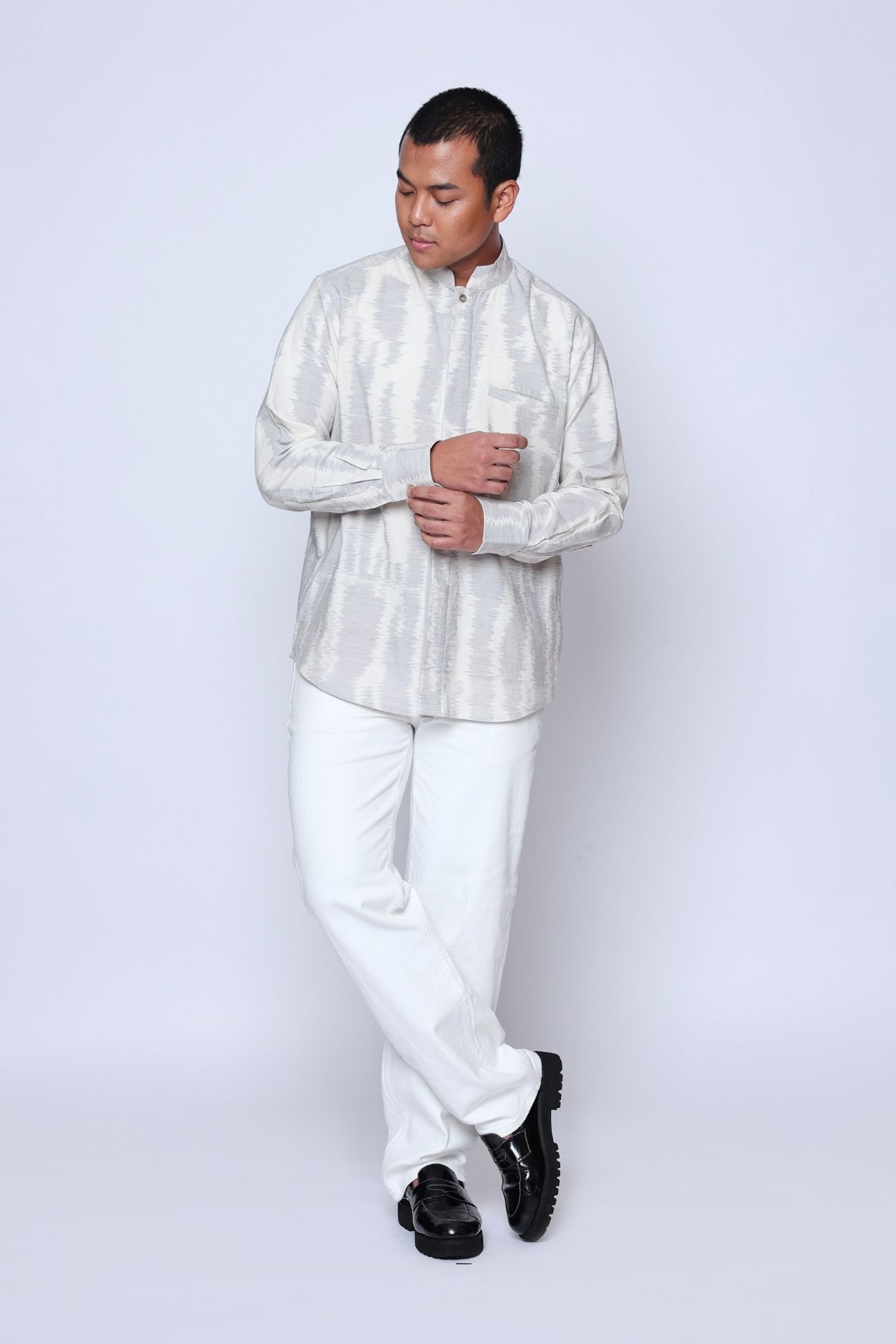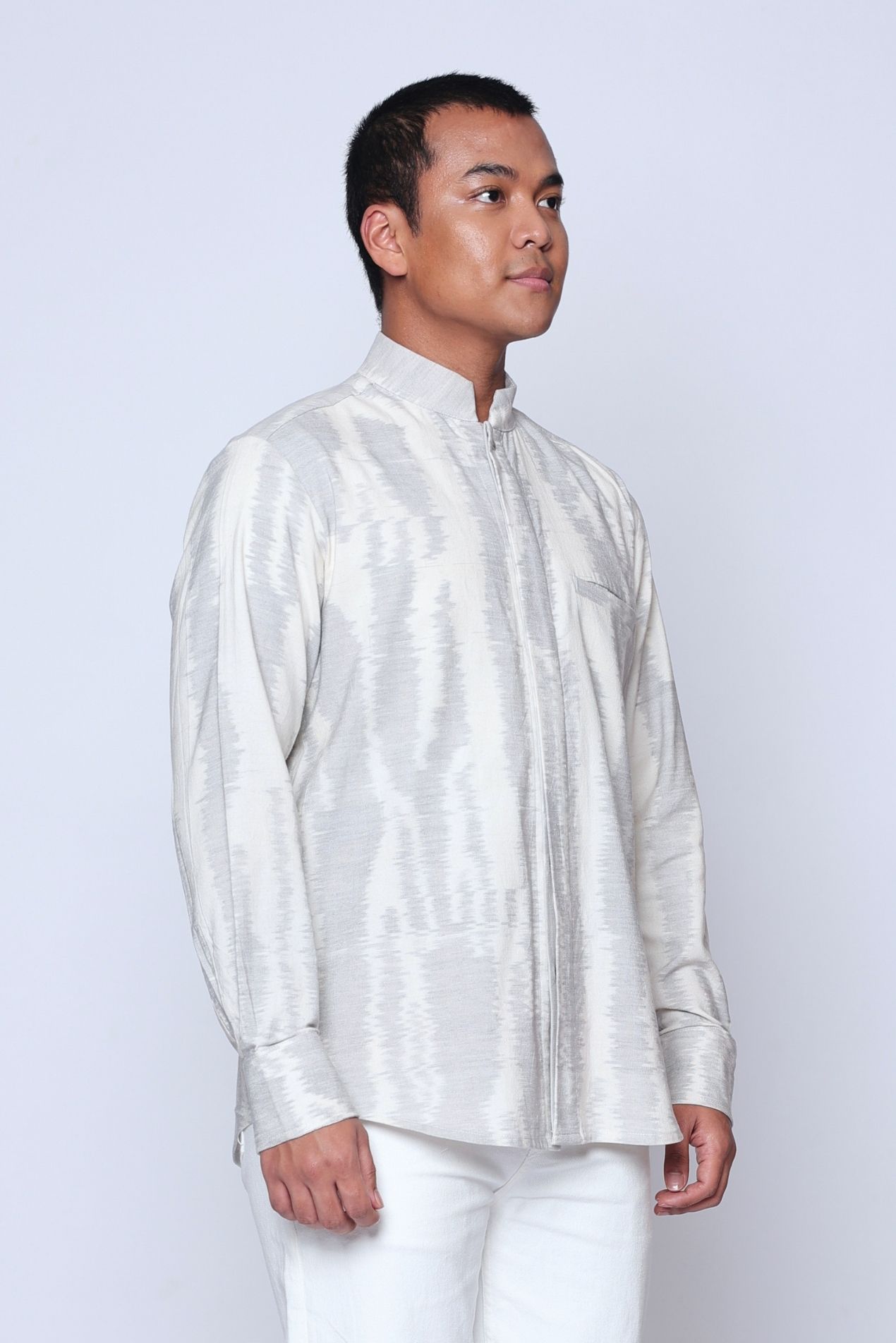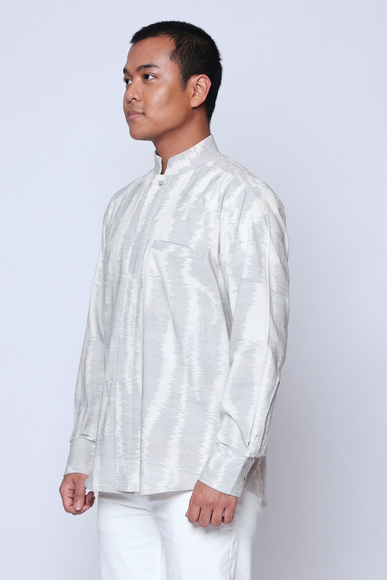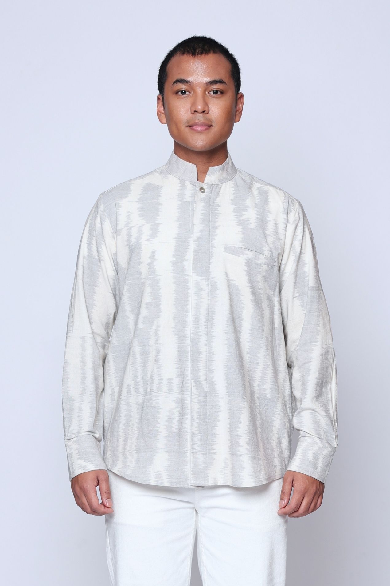 "Introducing the Baku Tenun Shirt, a distinguished addition to OE’s menswear collection, designed to honor tradition with refined elegance. Featuring a classic kerah koko neckline—an essential element in traditional Raya attire—this long-sleeve version offers a polished silhouette while embracing cultural heritage.